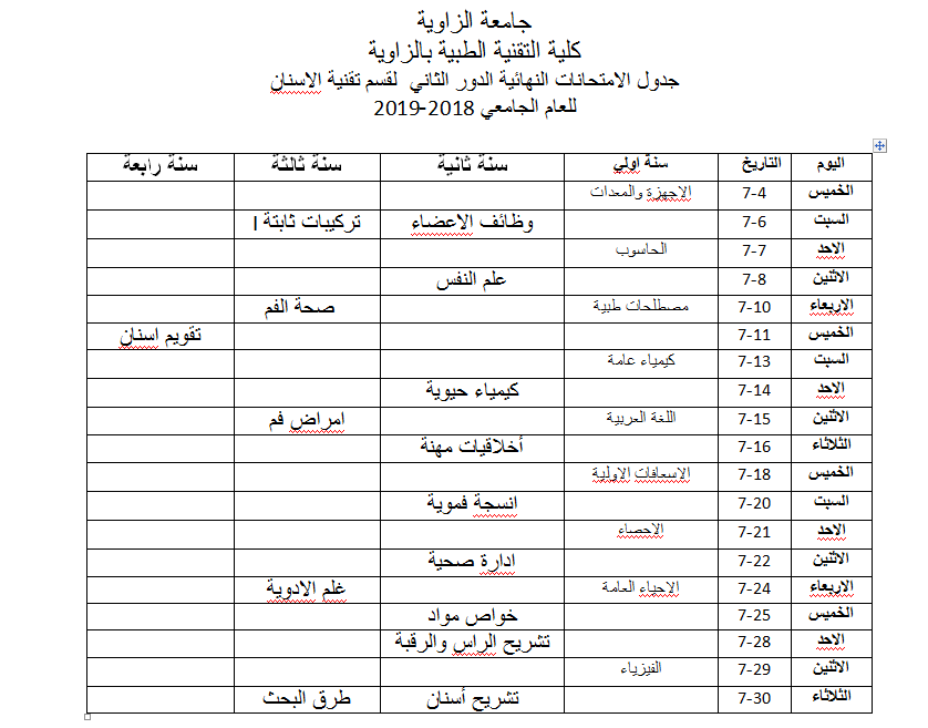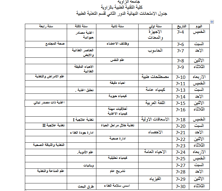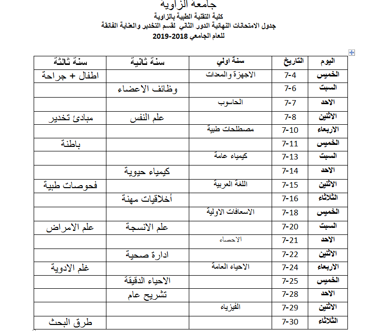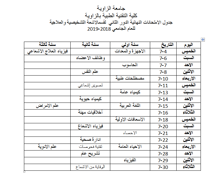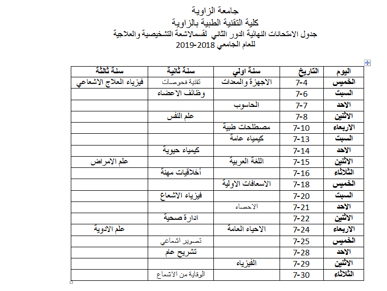 طلبة السنة الثانية بقسم الاشعة نعلمكم بانه حدث تغيير طفيف في جدول الدور الثاني لمادة التصوير الاشعاعي (يوم 11-7 بدلا من يوم 25-7 ومادة تقنية الفحوصات يوم 24-7 بدلا من 4-7