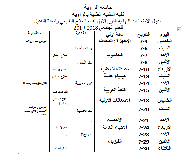 جدول الامتحان النهائي الدور الثاني 2018/2019 لقسم العلاج الطبيعي