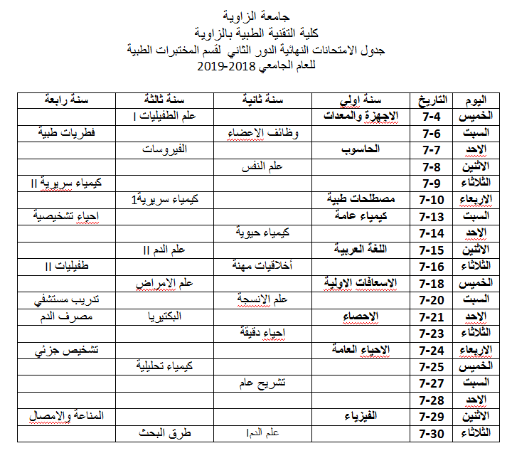 جدول الامتحان النهائي الدور الثاني 2018/2019 لقسم المختبرات