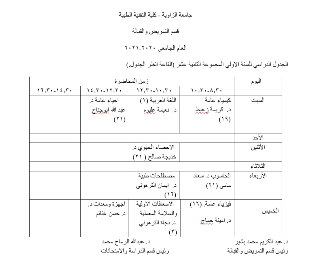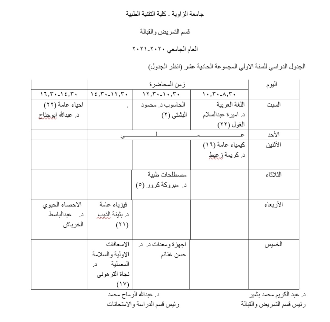 الجدول الدراسي للسنة الأولى للعام الجامعي 2021/2020م