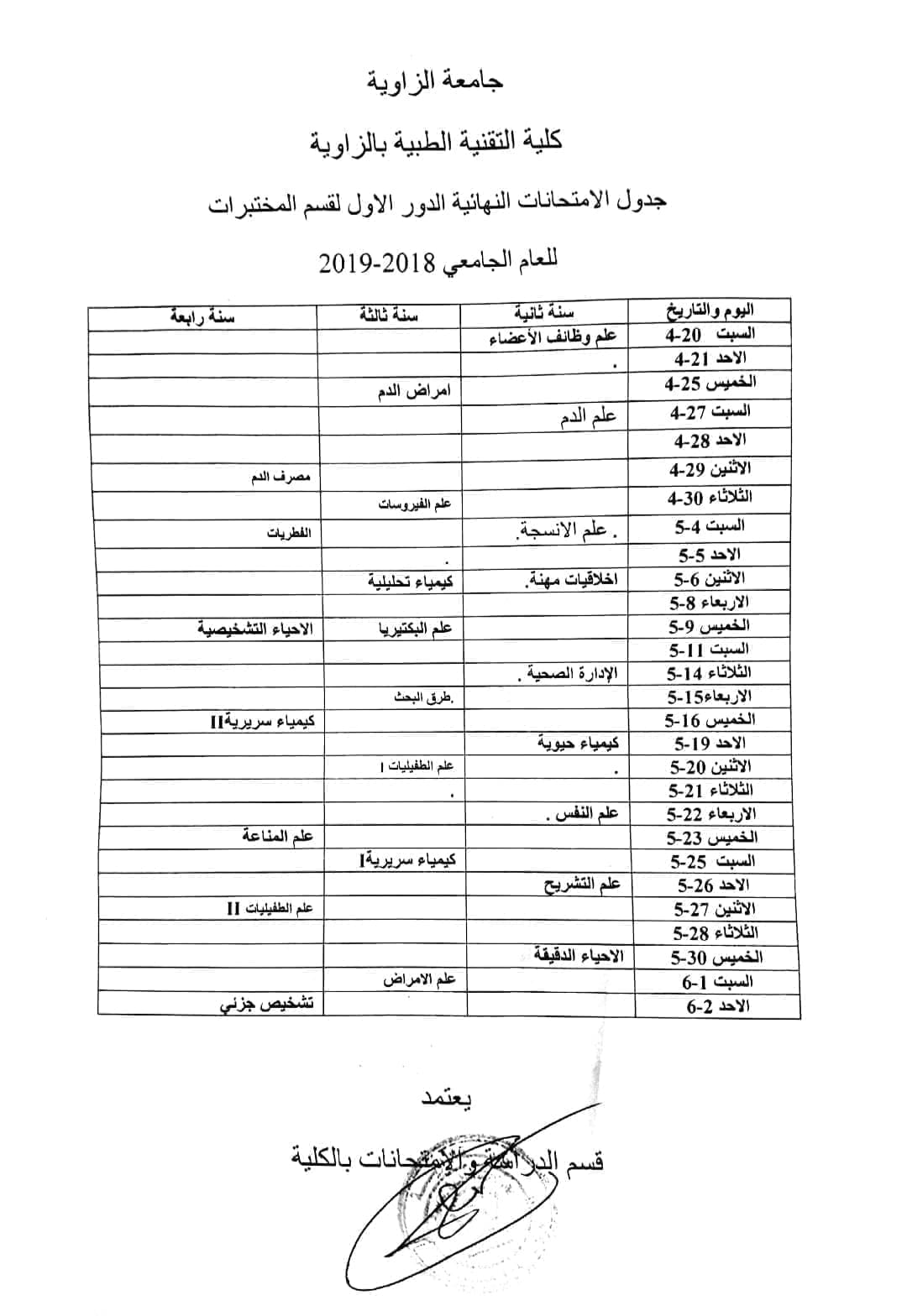 الأعزاء طلبة قسم المختبرات الطبية وقسم الأشعة التشخيصية والعلاجية .. مرفق بهذا الإعلان الجداول المعدلة الخاصة بأقسامكم للإمتحانات النهائية الدور الأول .. سائلين الله التوفيق للجميع .