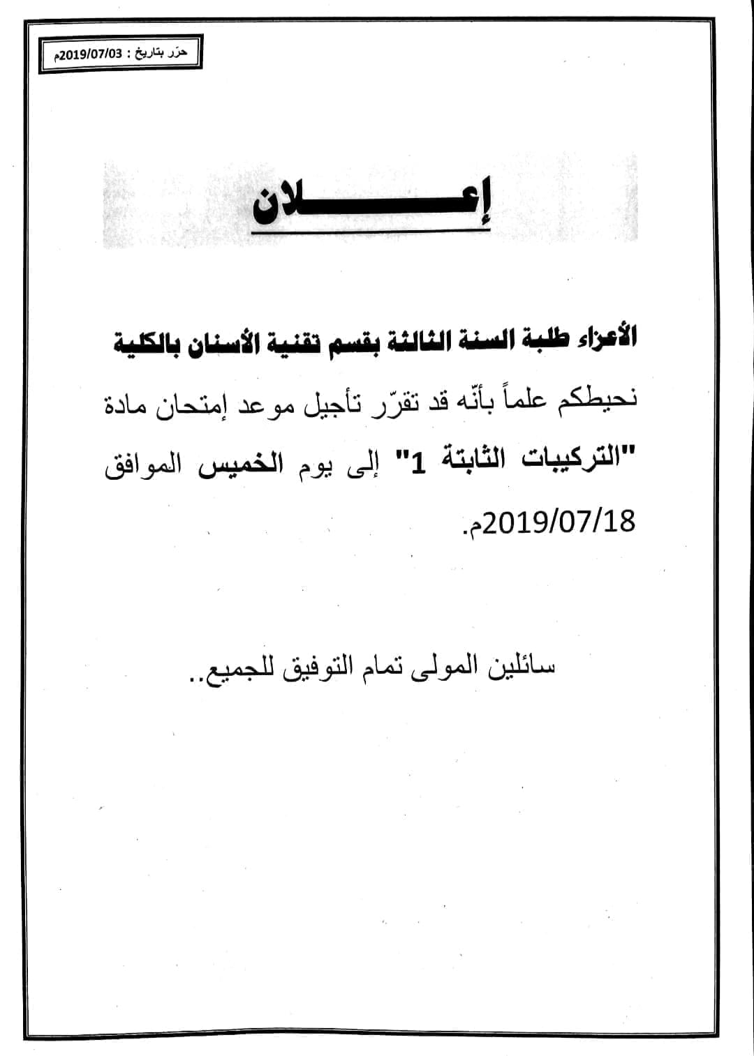 الأعزاء طلبة السنة الثالثة بقسم تقنية الأسنان