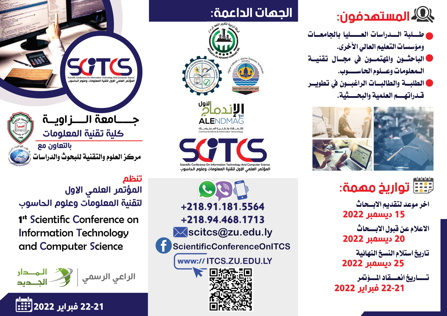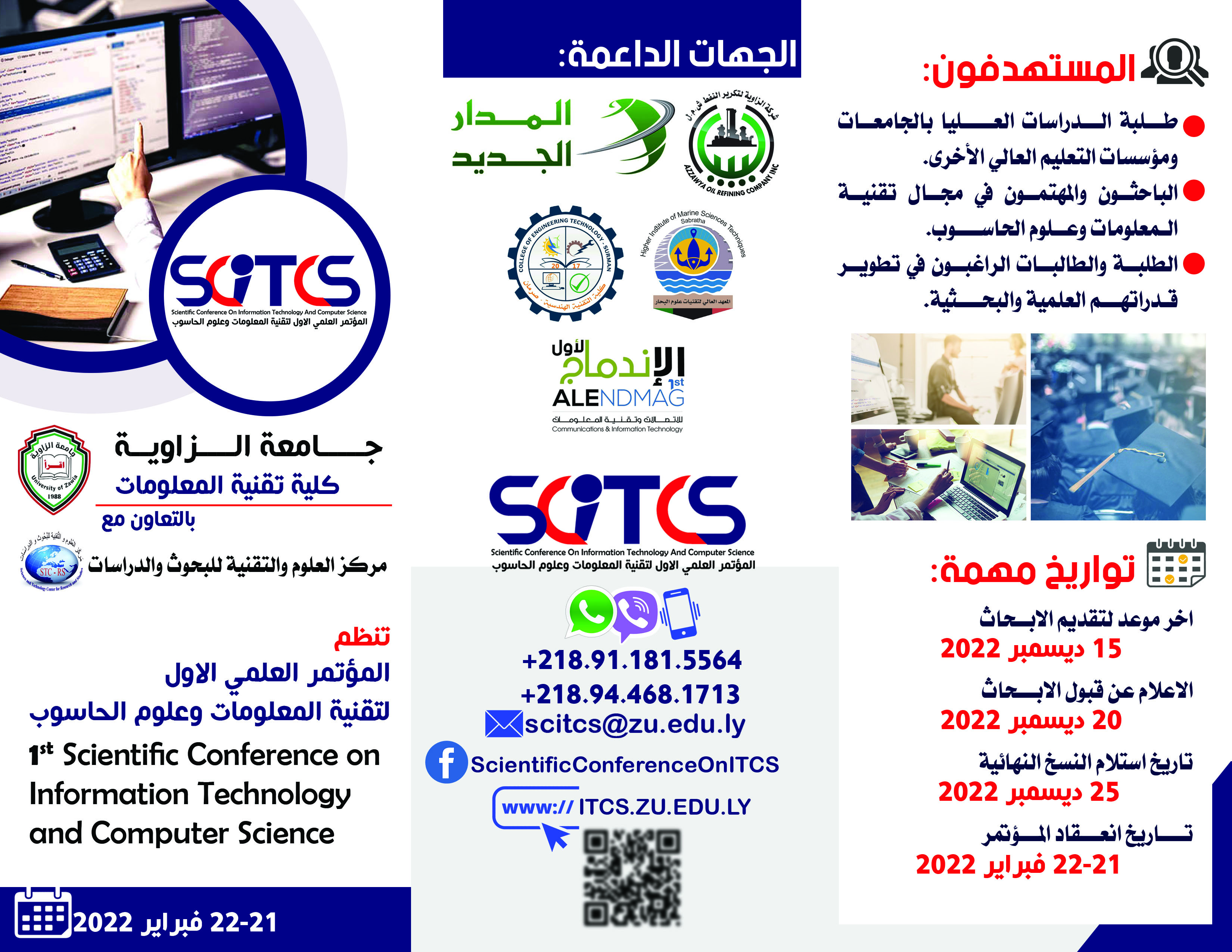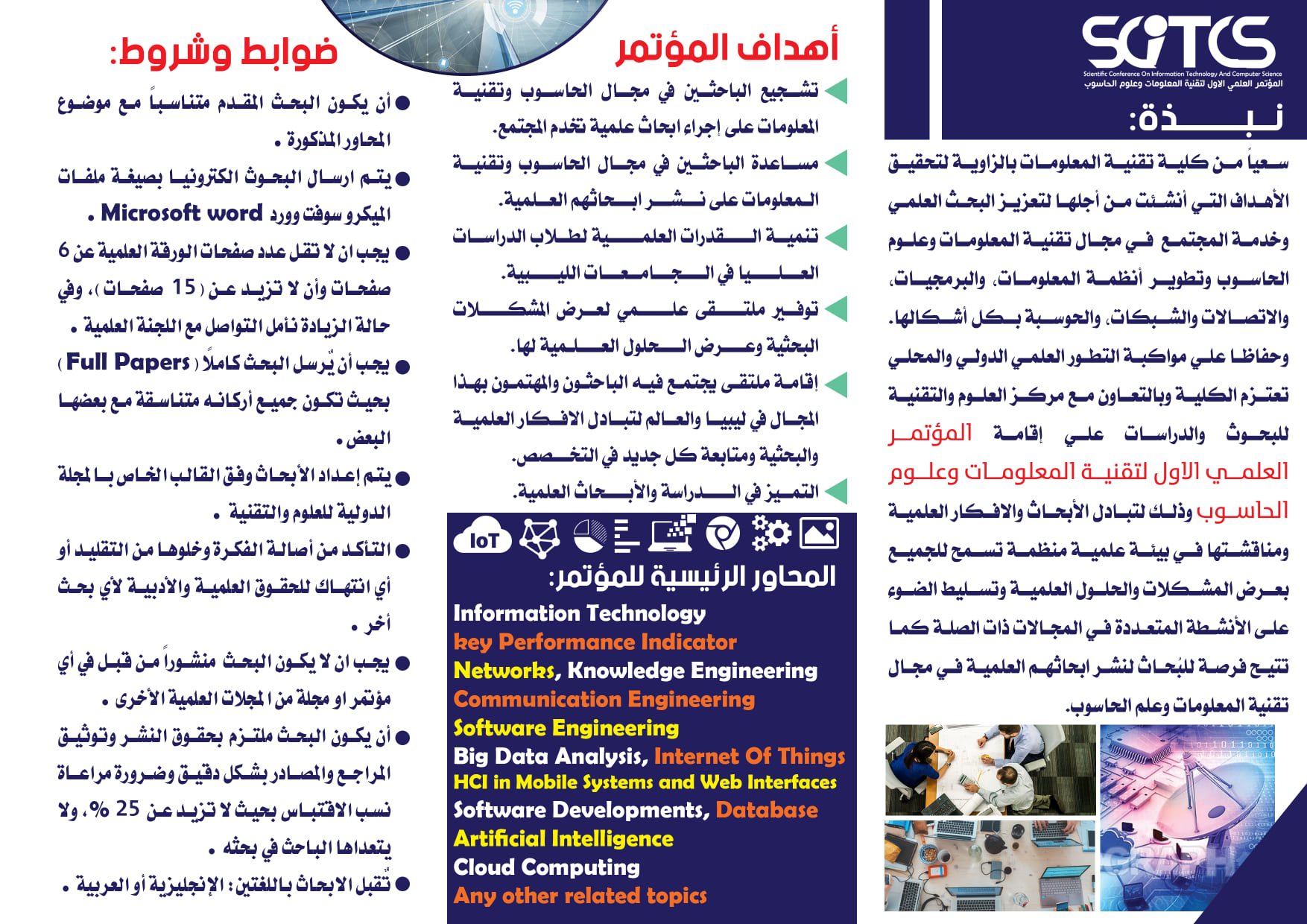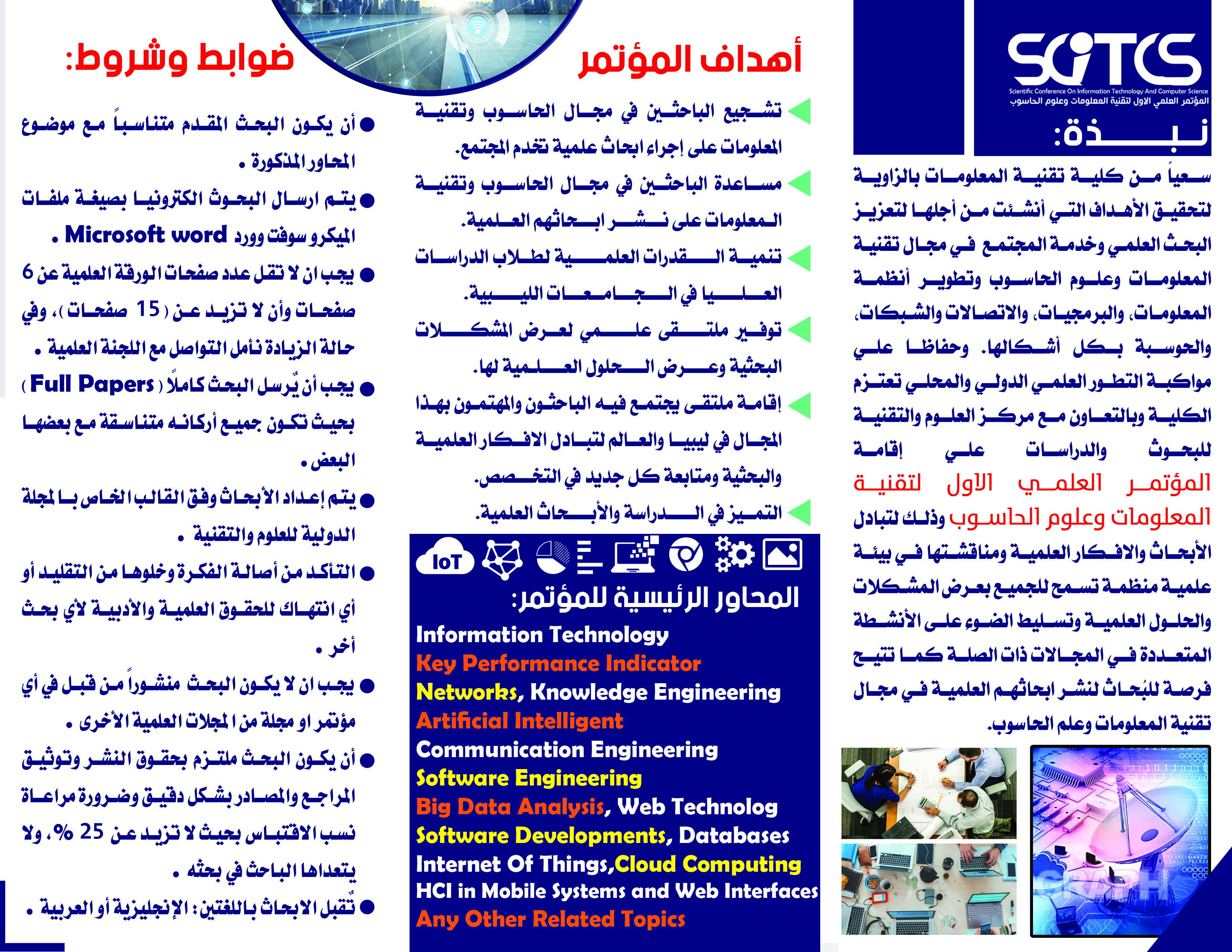 سعياً من كلية تقنية المعلومات بالزاوية لتحقيق الأهداف التي أنشئت من أجلها لتعزيز البحث العلمي وخدمة المجتمع في مجال تقنية المعلومات وعلوم الحاسوب وتطوير أنظمة المعلومات، والبرمجيات، والاتصالات والشبكات، والحوسبة بكل أشكالها. وحفاظا علي مواكبة التطور العلمي الدولي والمحلي تعتزم الكلية وبالتعاون مع مركز العلوم والتقنية للبحوث والدراسات علي إقامة المؤتمر العلمي الاول لتقنية المعلومات وعلوم الحاسوب وذلك لتبادل الأبحاث والافكار العلمية ومناقشتها في بيئة علمية منظمة تسمح للجميع بعرض المشكلات والحلول العلمية وتسليط الضوء على الأنشطة المتعددة في المجالات ذات الصلة كما تتيح فرصة للبُحاث لنشر ابحاثهم العلمية في مجال تقنية المعلومات وعلم الحاسوب.
