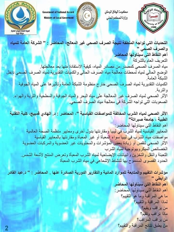 " نظرا لما تعانيه المنطقة الغربية بشكل عام ومدينة الزاوية بشكل خاص من خطر تهديد تلوث مصادر المياه الجوفية بمياه الصرف الصحي وكذلك تسارع تقدم مياه البحر بمعظم الخزانات الساحلية,تعلمكم كلية هندسة النفط والغاز بجامعة الزاوية بالتعاون مع المجلس البلدي الزاوية والهيئة العامة للمياه و وزارة الحكم المحلي، أنها بصدد إقامة يوم علمي بعنوان " مستقبل المياه في ليبيا" والتي سيتم انعقادها بدار الكتاب بمدينة الزاوية بتاريخ 16 سبتمبر 2019 من الساعة 9:30 صباحا عليه نوجه الدعوة الي جميع البحاث و الأكاديميين و المسؤولين في المنطقة الغربية للحضور لإثراء النقاش و المساهمة في الرفع من مستوي الوعي بالمخاطر التي تهدد الوضع المائي للمدينة و المنطقة