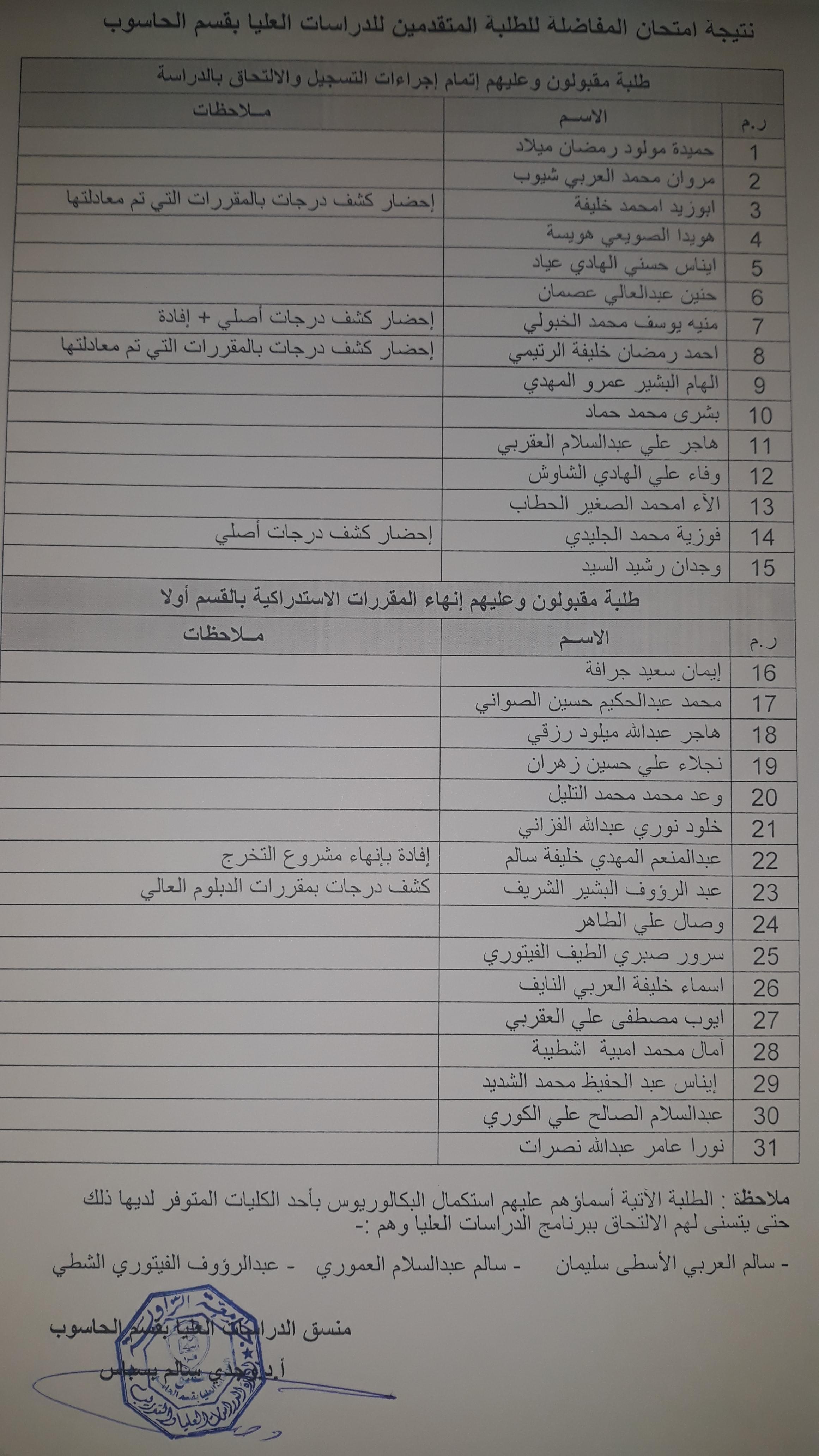 نتبجة امتحان المفاضلة للطلبة المتقدمين للدراسات العليا بقسم الحاسوب للفصل الدراسي ربيع 2018 / 2019