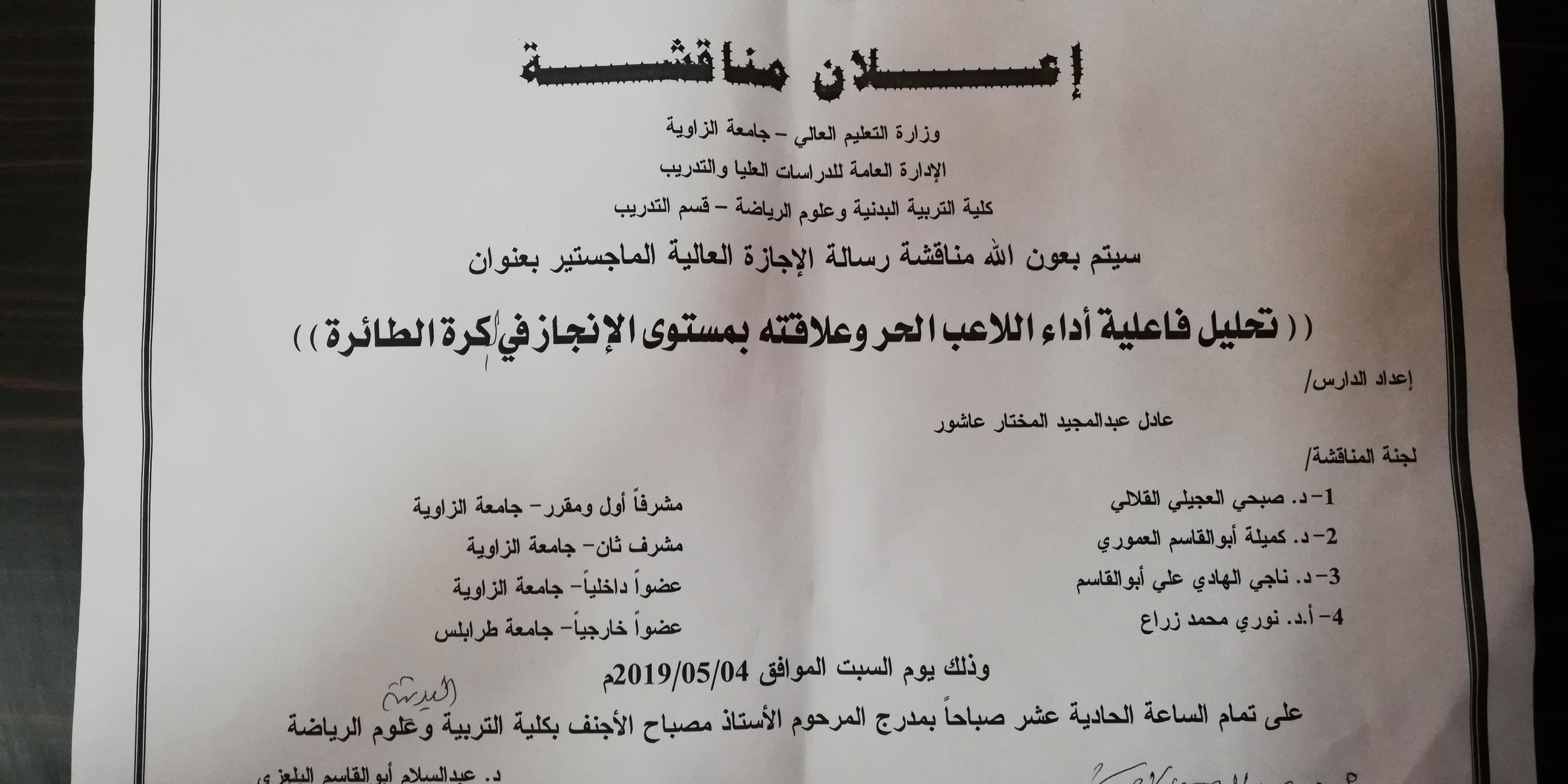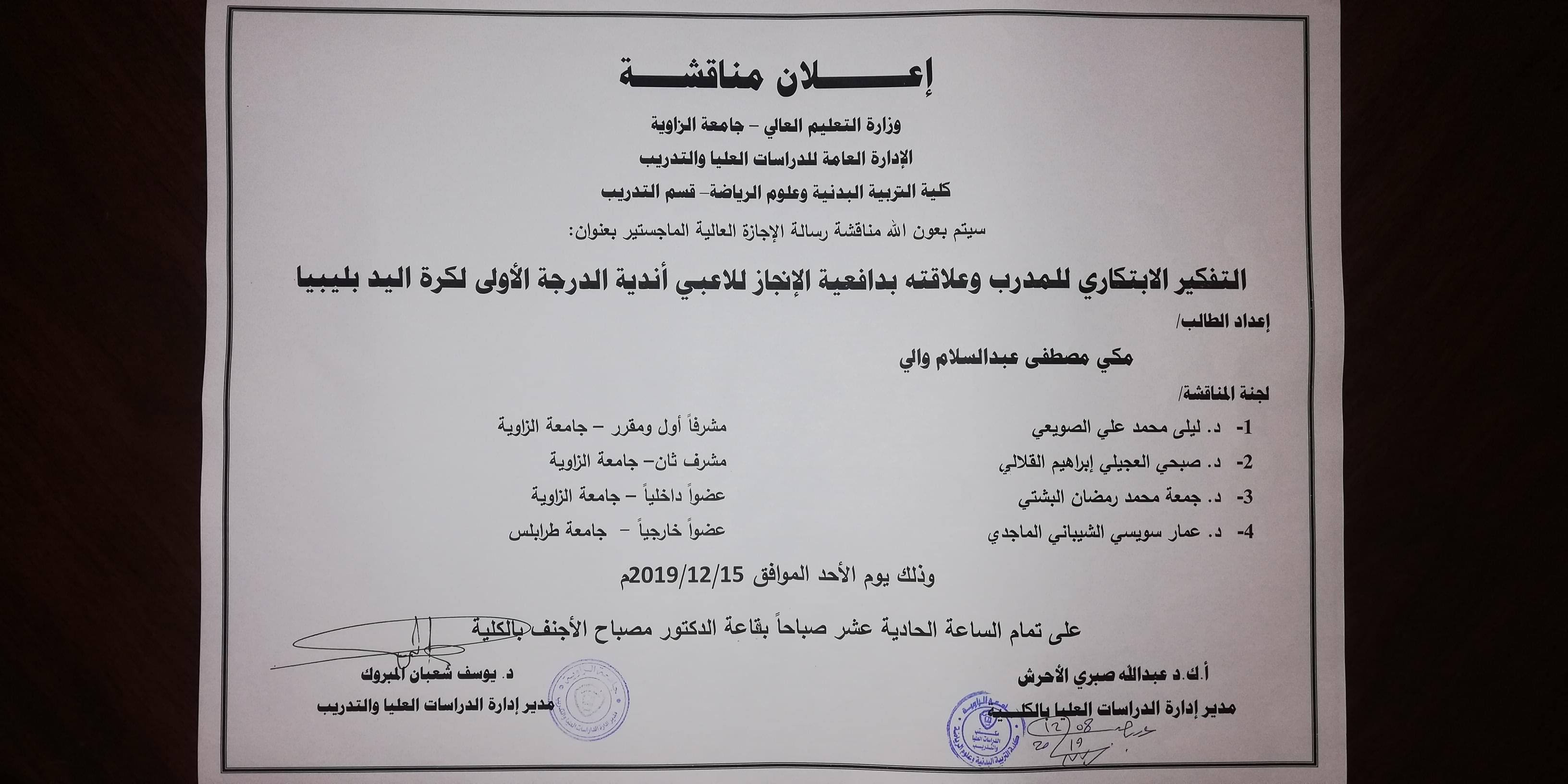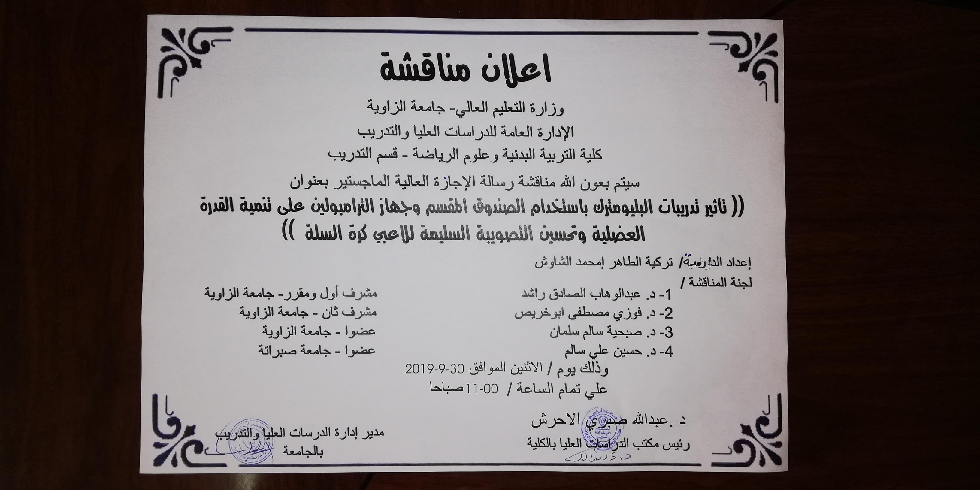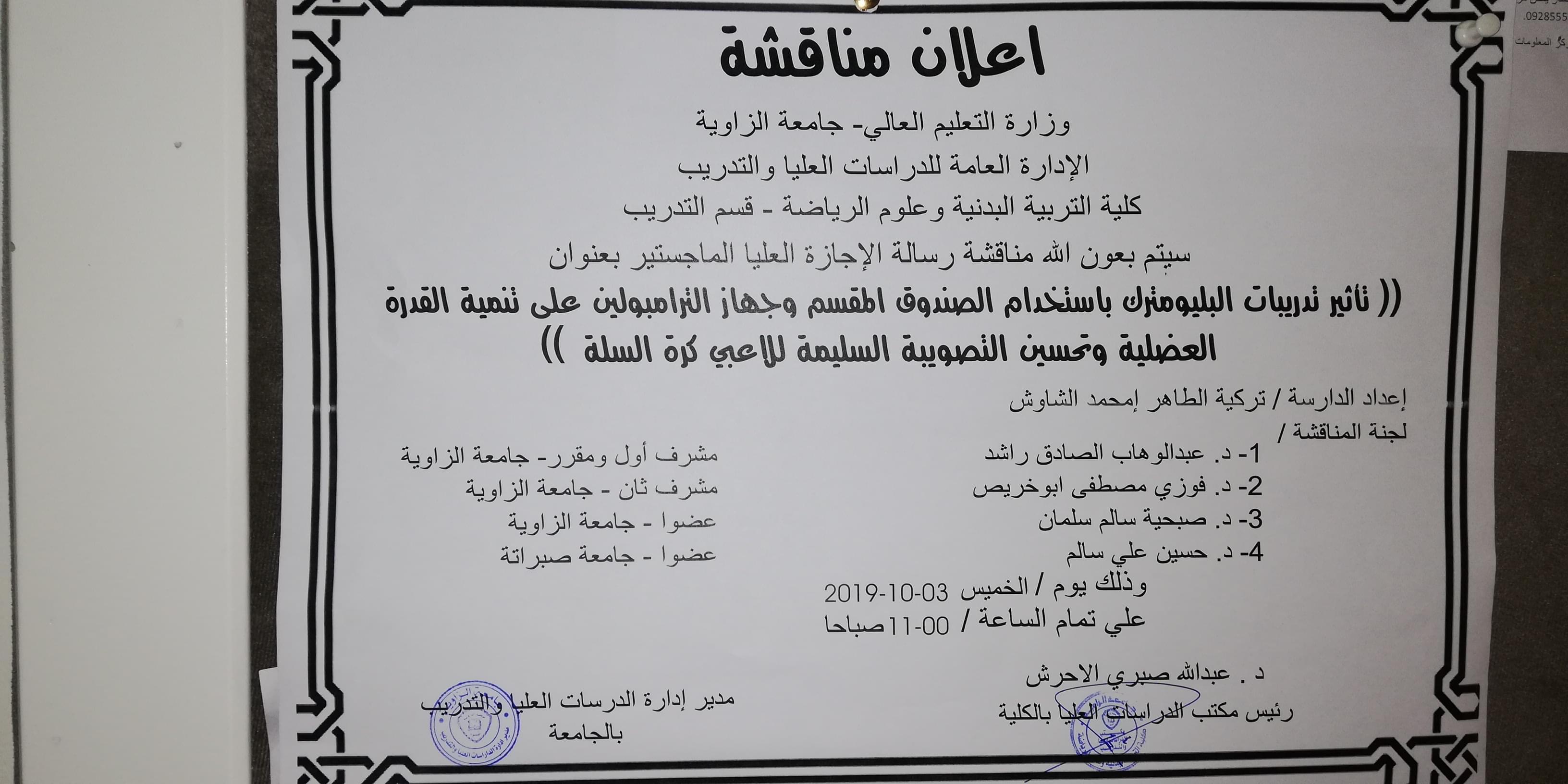 يعلن مكتب الدراسات العليا بالكلية عن تحديد موعد لمناقشة رسالة الماجستير في التدريب الرياضي/ كرة السلة للدارسة تركية الطاهر الشاوش.. وبأشراف الدكتور / عبدالوهاب الصادق راشد كمشرف أول - د. فوزي مصطفى المنير كمشرف ثاني ويناقش هذه الأطروحة د. صبحية سالم سلمان مناقش داخلي جامعة الزاوية - حسين الذوادي مناقش خارجي جامعة صبراته.، كما ستتم المناقشة يوم الأثنين 30-9-2019م على تمام الساعة 11:00 صباحاً.