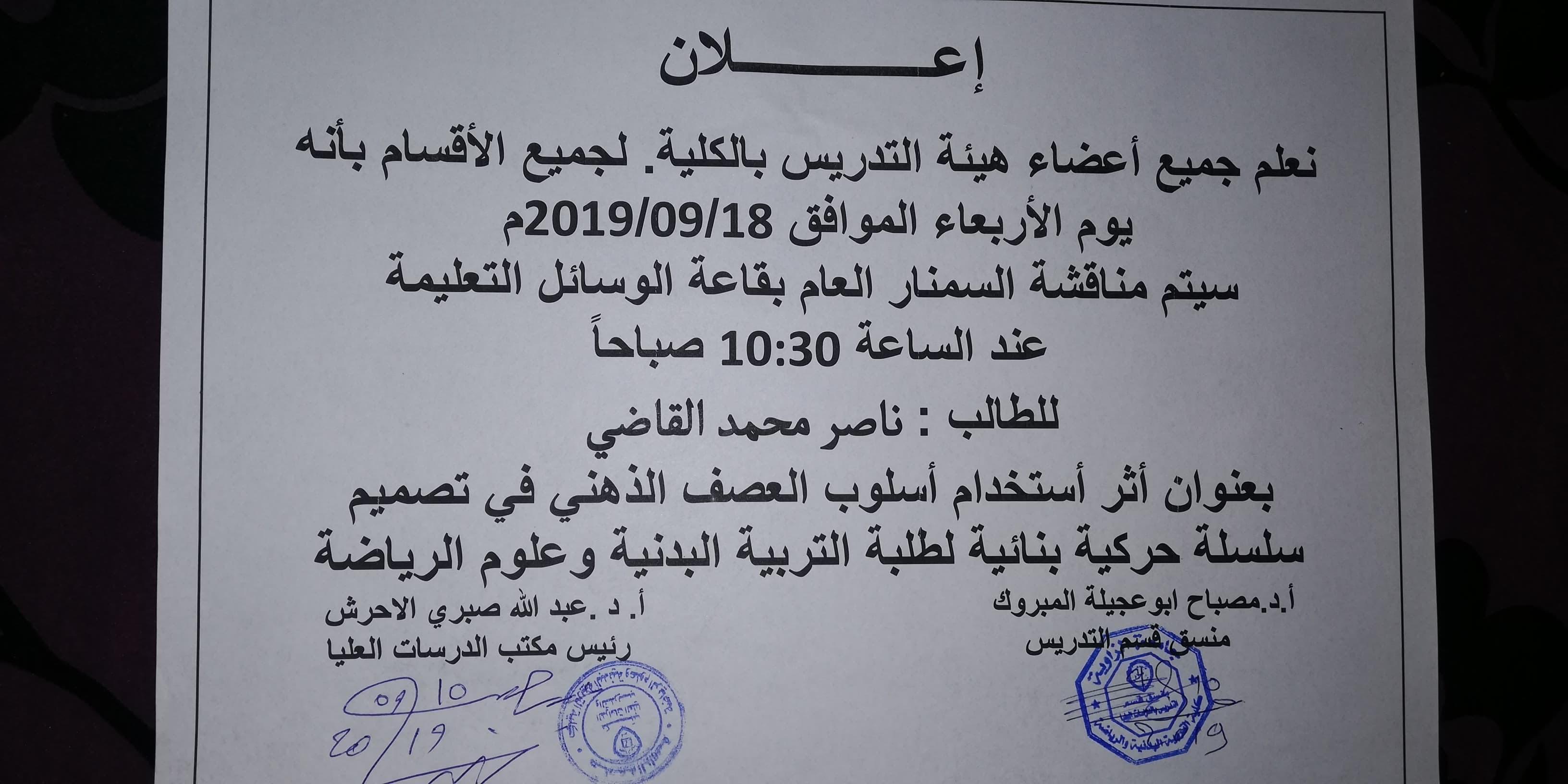 يعلن مكتب الدراسات العليا بكلية التربية البدنية وعلوم الرياضة .. أنه سيتم مناقشة موضوع بحث للدارس ناصر محمد القاضي الدارس بقسم التدريس ببحث بعنوان " أثر استخدام العصف الذهني في تصميم سلسلة حركية بنائية لطلبة التربية البدنية وعلوم الرياضة " ذلك يوم الأربعاء الموافق 18/9/2019م على تمام الساعة العاشرة والنصف صباحاً بقاعة الوسائل التعليمية .