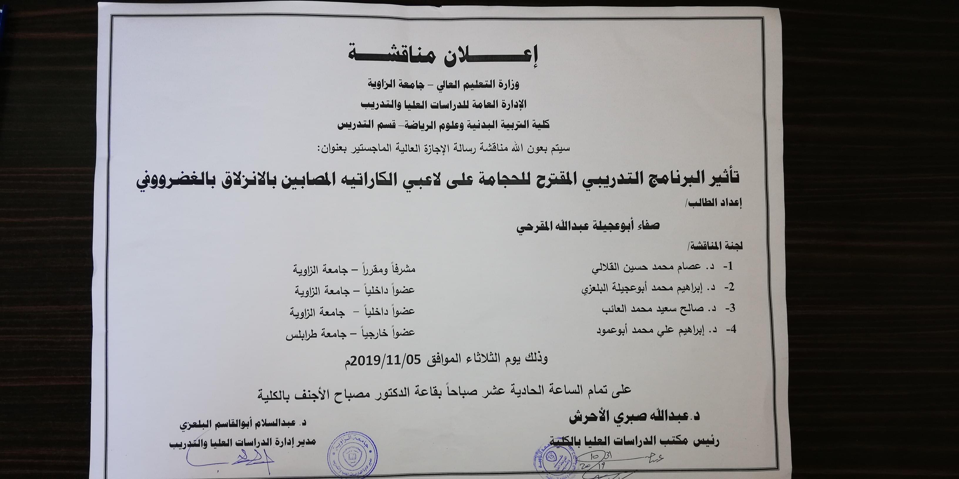 سيتم بعون الله تعالى مناقشة رسالة الماجستير للدارسة صفاء ابوعجيلة المقرحي بعنوان " تأثير البرنامج التدريبي المقترح للحجامة على لاعبي الكاراتيه المصابين بالانزلاق الغضروفي لنيل درجة الماجستير في التربية البدنية