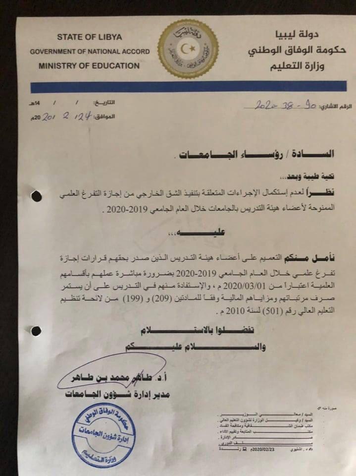 السادة أعضاء هيئة التدريس الذين قضوا إجازة التفرغ العلمي الشق الداخلي... يطلب منكم مباشرة أعمالكم من تاريخ 1-3-2020م للأهمية يطلب الإلتزام...... كلية التربية البدنية وعلوم الرياضة..