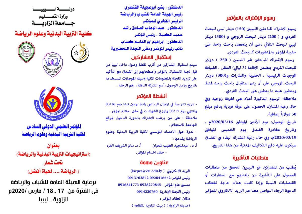 السيدات والسادة عند تعذر دخولك لتطبيق الزوم ومشاهدة فعليات المؤتمر العلمي الدولي السادس لكلية التربية البدنية وعلوم الرياضة عليك بالتوجه إلى قناة جامعة الزاوية على اليوتيوب. بمسمى جامعة الزاوية.
