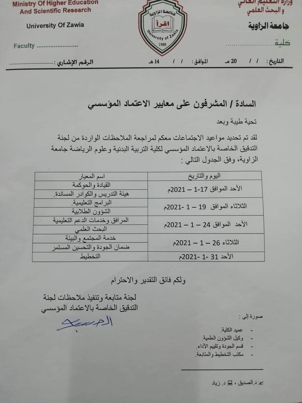 السادة المكلفون بملفات الجودة للإعتماد المؤسسي... في الوقت الذي نشكركم فيه على ما تبذلون من جهد للوصول إلى الإعتماد في الوقت الذي يتخلف فيه العديد من أعضاء هيئة التدريس عن العمل &بأسم السيد عميد الكلية والسادة بمجلس الكلية نثمن ونقدر هذه الجهود التي رفعتم بها قدر هذه المؤسسة.. عليه نُعلمكم بأنكم مدعوون لإجتماع تقابلي يجمع كل من عمل بملفات الجودة ذلك يوم الخميس على تمام الساعة العاشرة صباحاً مصحوبين بنسخة كاملة من الملفات التي قُدمت للمركز.