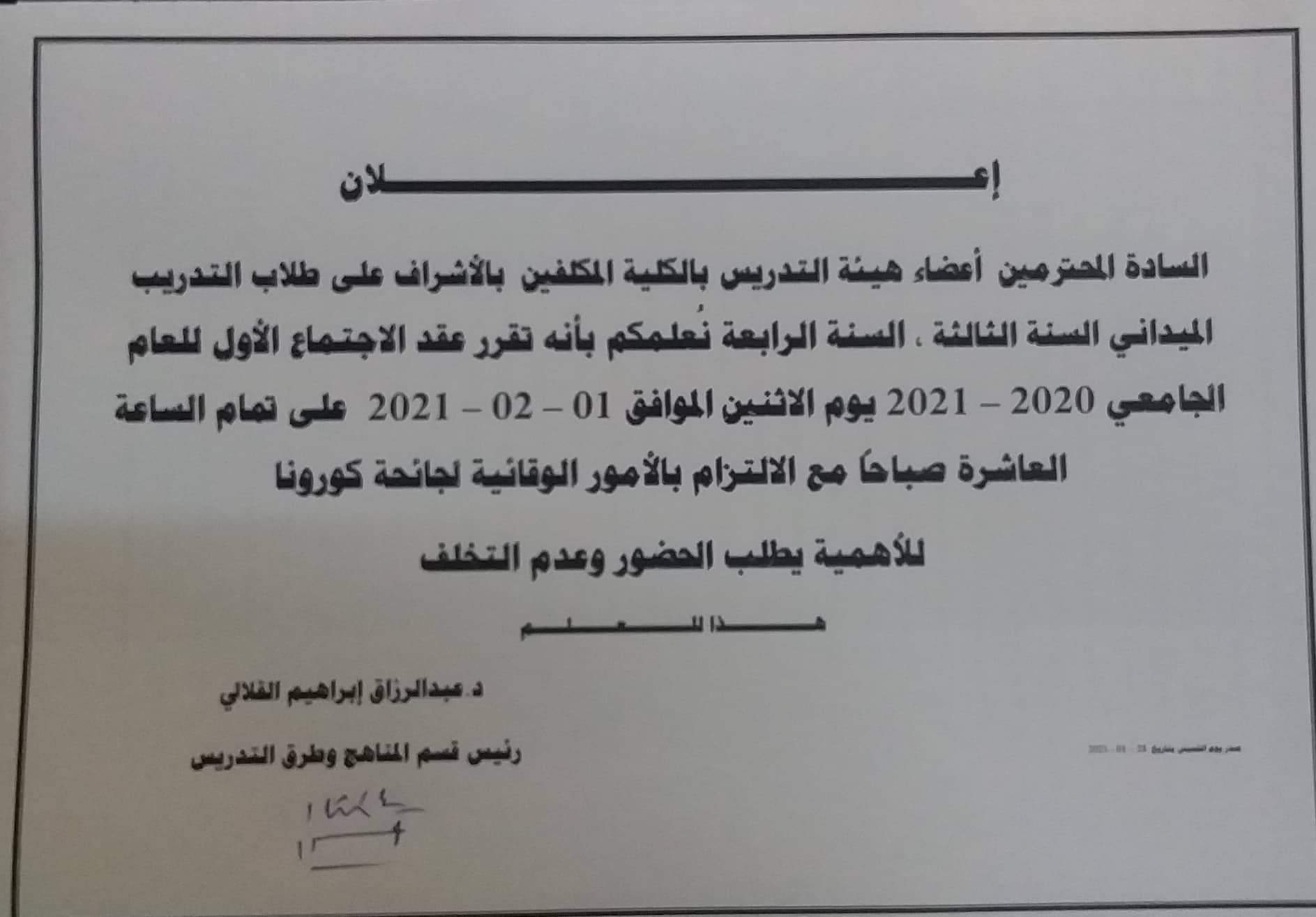 السادة أعضاء هيئة التدريس بالكلية المشرفين على مقرر التدريب الميداني... يطلب منكم حضور الأجتماع الذي تقرر عقده يوم الاحد الأحد الموافق 28 - 6 - 2020 بالنسبة للمشرفين على طلاب السنة الثالثة ويوم الثلاثاء الموافق 30-6-2020م بالنسبة للمشرفين على طلاب السنة الرابعة علماً بأن الاجتماع الساعة العاشرة صباحاً للأهمية يطلب الحضور...