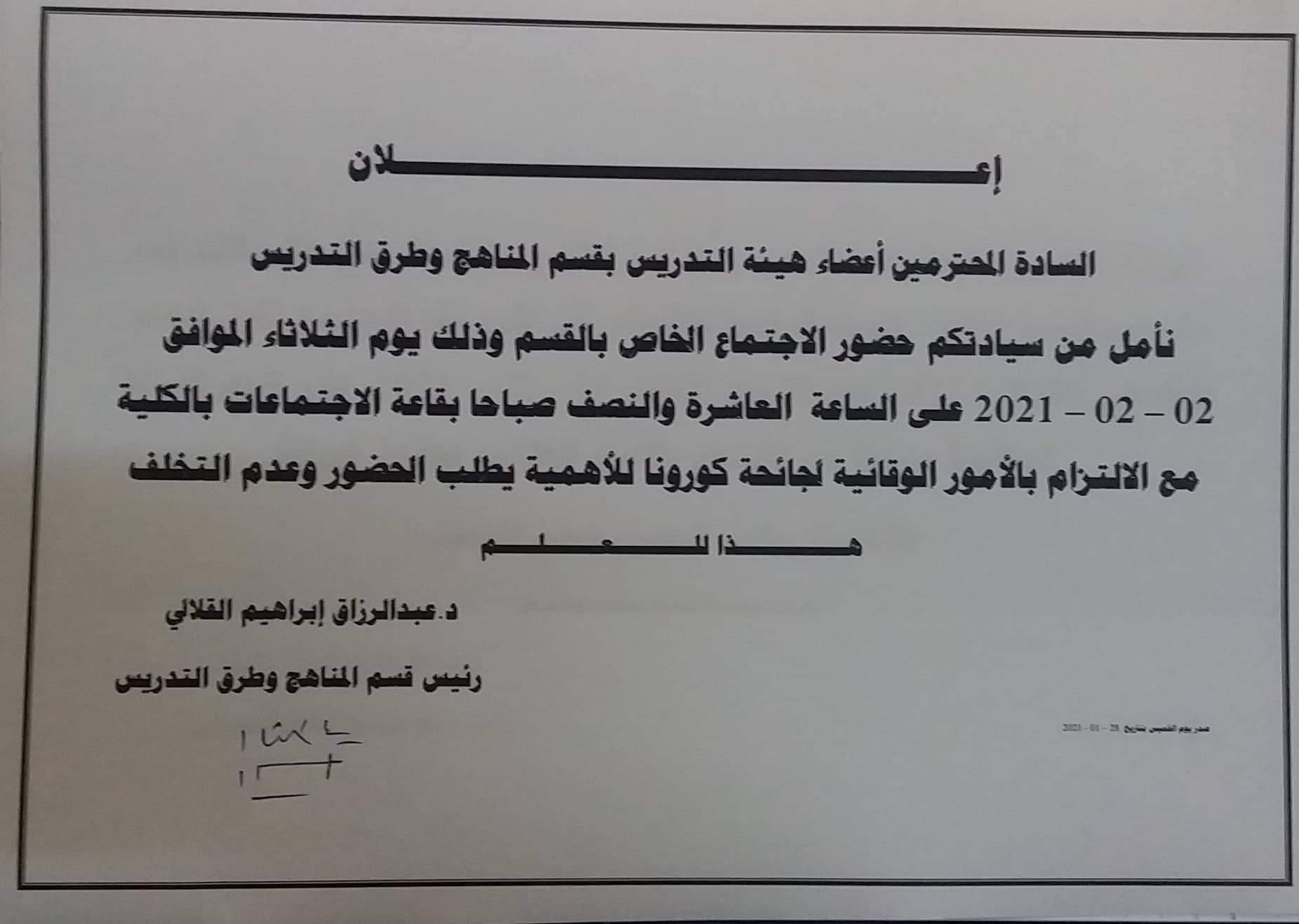 السادة أعضاء مجلس قسم المناهج وطرق التدريس مدعوون لحضور إجتماع المجلس حسب المرفق.... يطلب التقيد