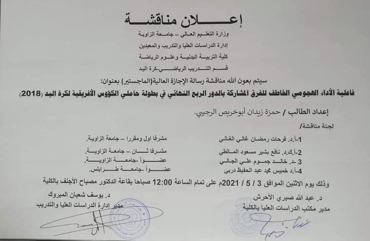 سيتم بعون الله تعالى يوم الأثنين الموافق 3/5/2021 على تمام الساعة الثانية عشر ظهراً مناقشة رسالة علمية لنيل درجة الماجستير في التربية البدنية وعلوم الرياضة للدارس حمزة زيدان الرجيبي