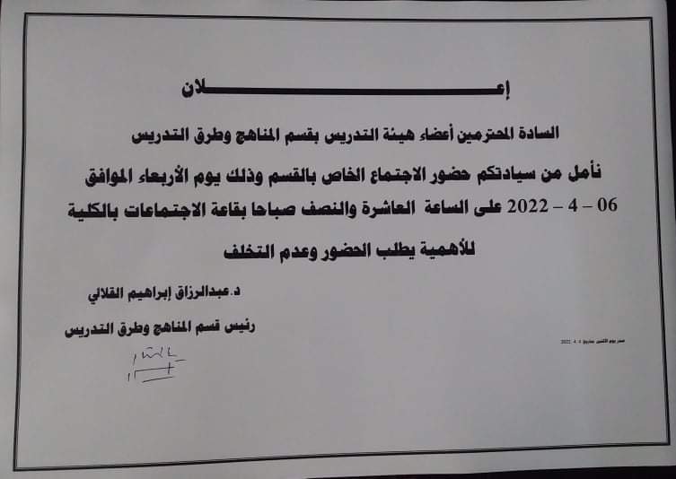 إعلان أجتماع قسم المناهج وطرق التدريس....