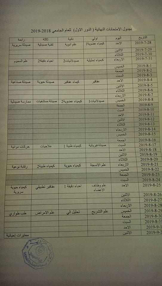 جدول الامتحانات النهائية (الدور الأول ) للعام الجامعي 2018_2019