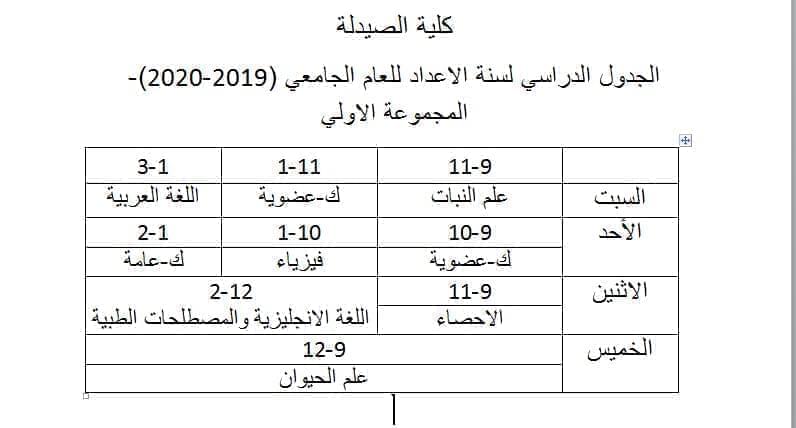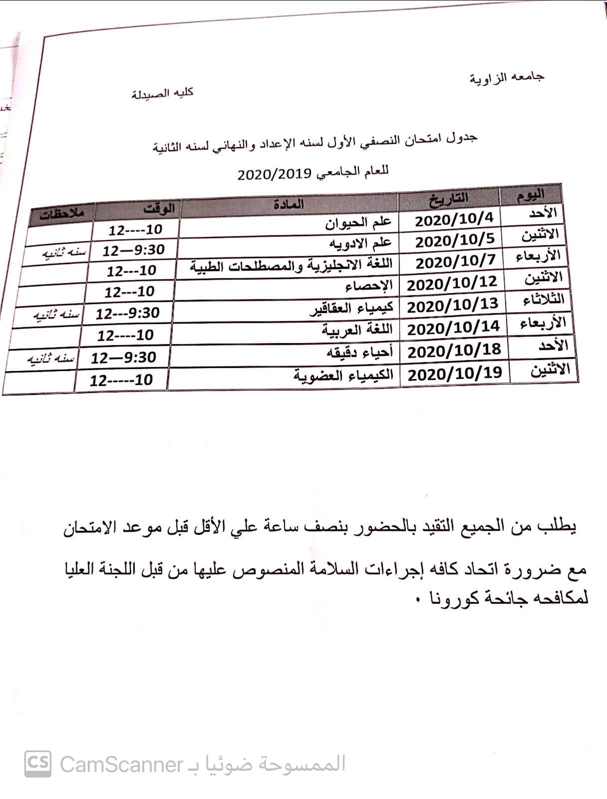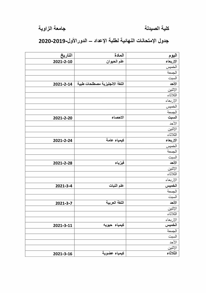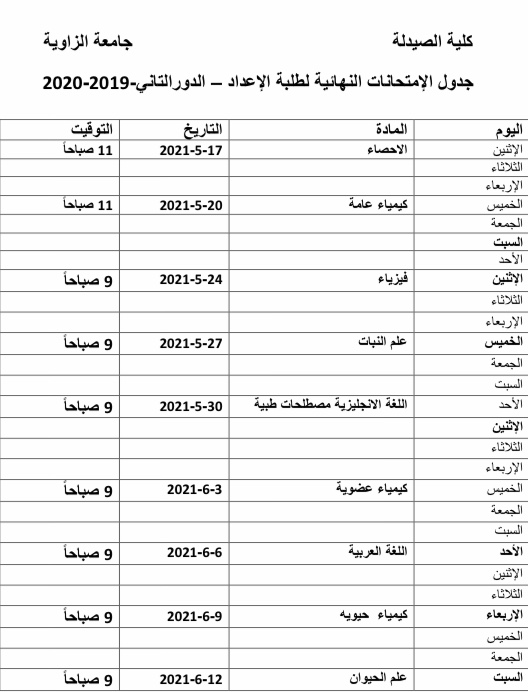 تعلن كلية الصيدلة جامعة الزاوية لطلابها الأعزاء أنه قد تقرر إستئناف الدراسة بالكلية إعتبارا من يوم الثلاثاء الموافق 2019/11/19 م وفقاللجدول الآتي :-
