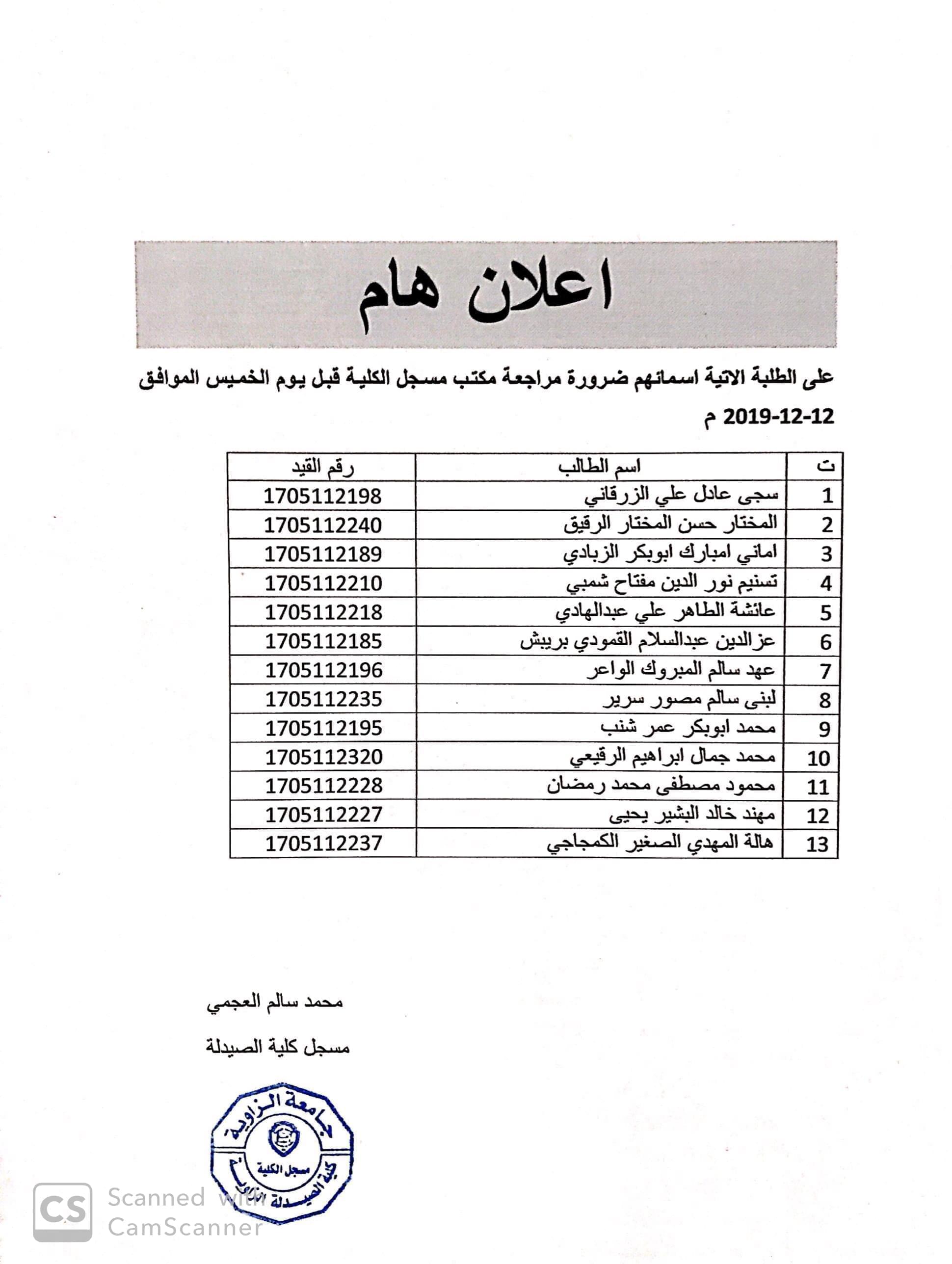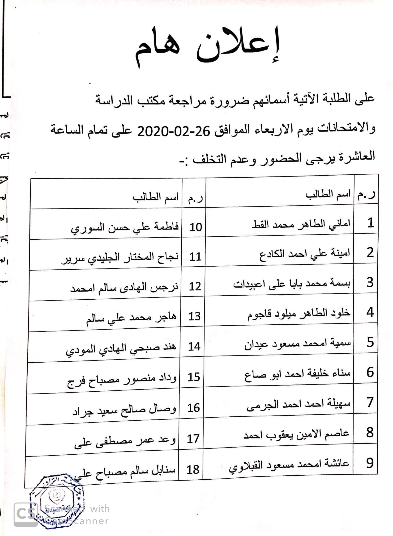 على الطلبة الاتية اسمائهم مراجعة مكتب الدراسة والامتحانات في الوقت المحدد .