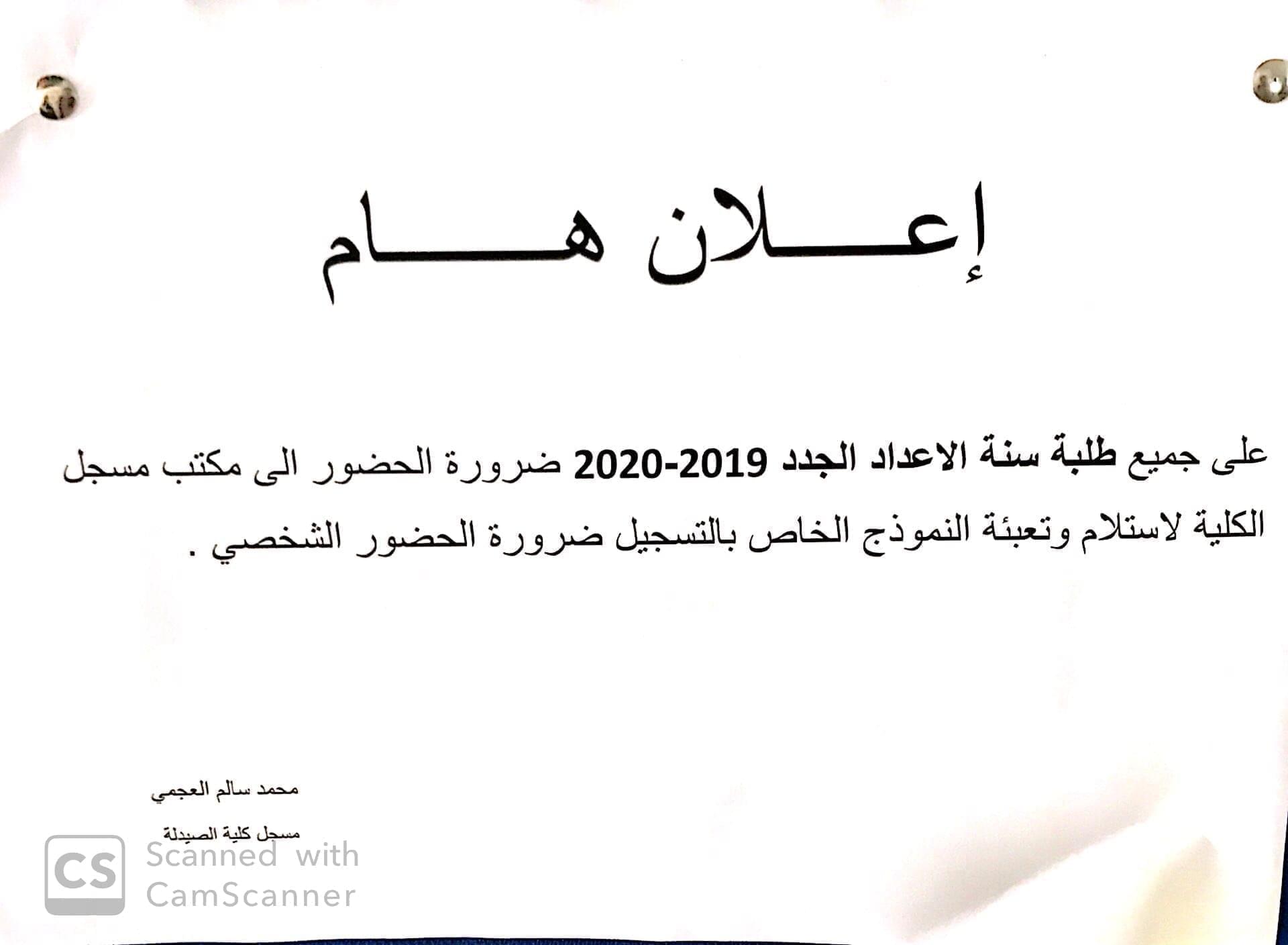 على جميع طلبة الاعداد الجدد لسنة 2019-2020 ضرورة الحضور الى مكتب المسجل لتعبئة النموذج الخاص بالتسجيل بالكلية .