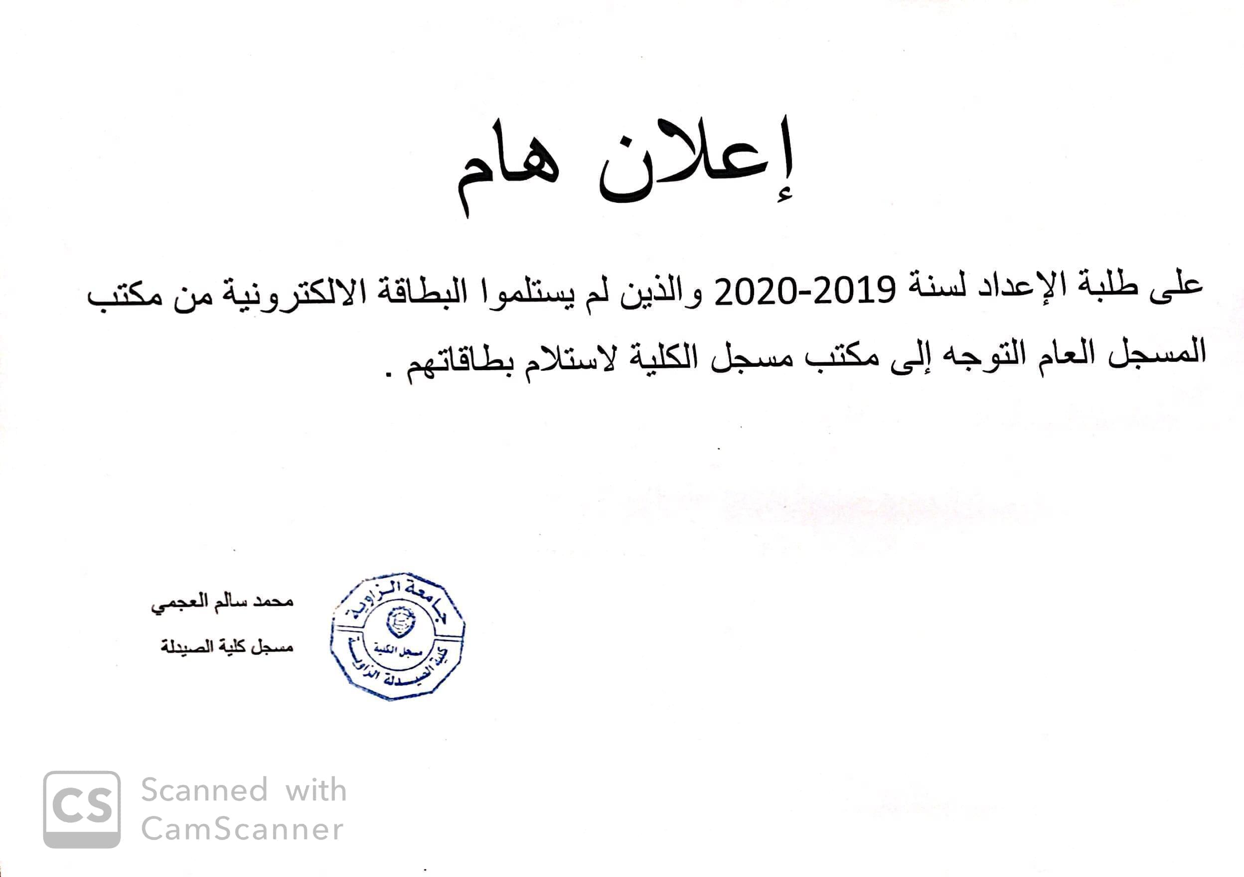علي طلبة سنة الاعداد 2019-2020 والذين لم يستلموا البطاقة الالكترونية من مكتب المسجل العام التوجه الي مكتب مسجل الكلية لاستلام بطاقاتهم .