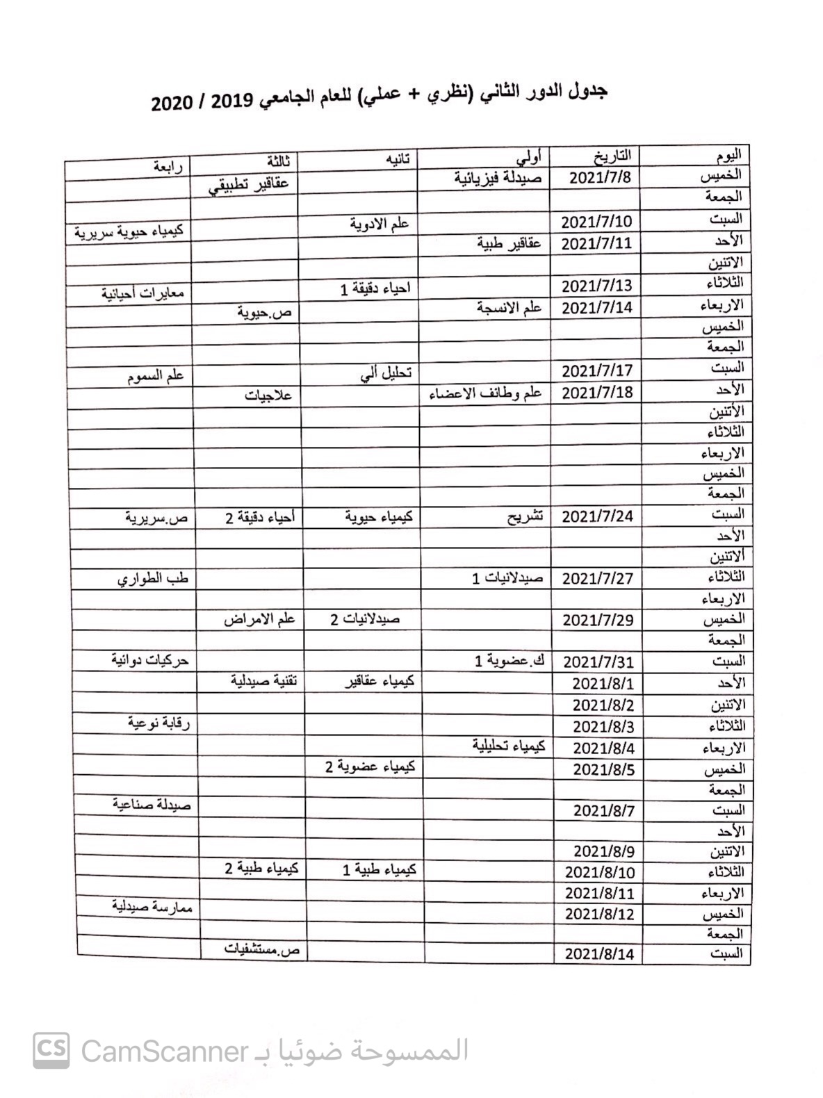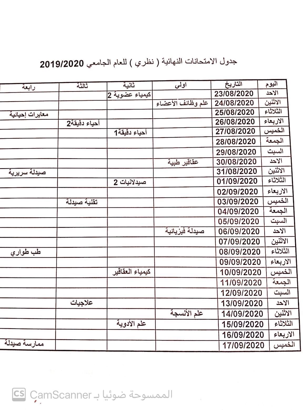 جدول الامتحانات النهائية (عملي ) للعام الجامعي 2020/2019