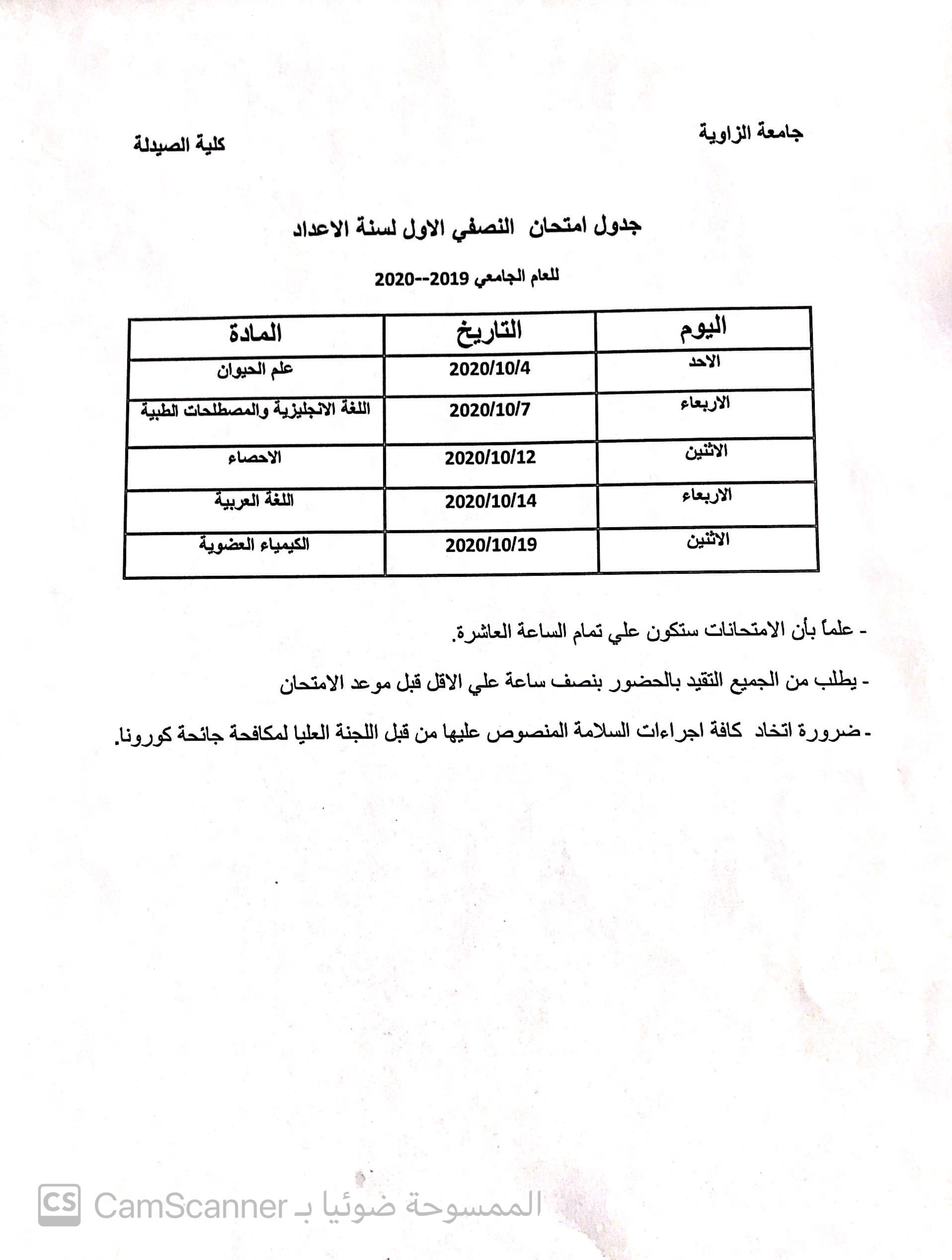 السلام عليكم ورحمة الله وبركاته إعلان هام لطلبة سنة الإعداد نحيطكم علماً بإن إمتحان النصفى الأول سيبدأ بمشيئة الله يوم السبت الموافق 23-3- 2019 وفقاً للجدول المرفق أدنه.وفقكم الله هناء اصميدة منسق سنة الإعداد.