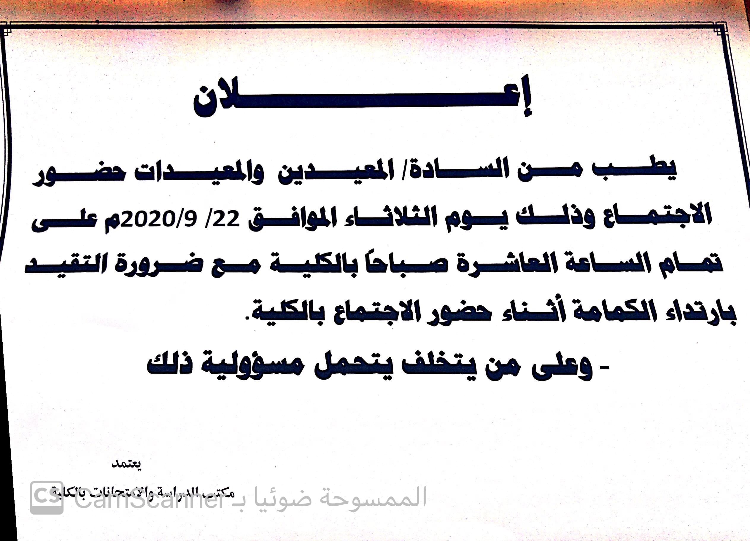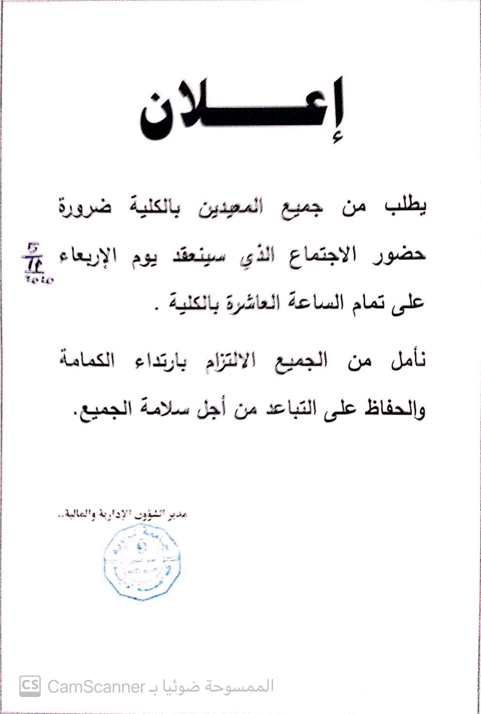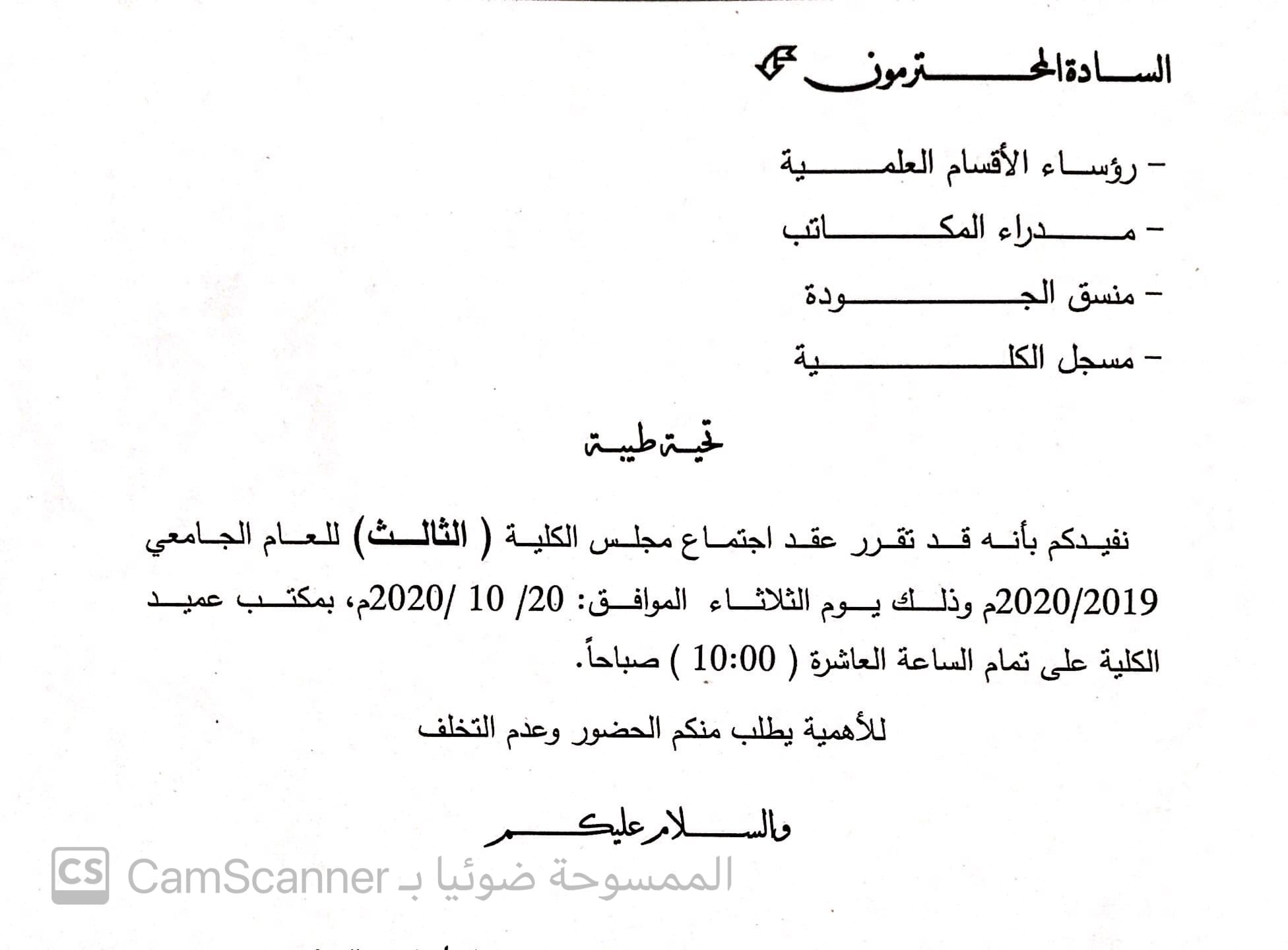 نفيدكم بانه قد تقرر عقد اجتماع مجلس الكلية ( الاول ) للعام الجامعي 2020/2019 م وذلك يوم الاحد الموافق 2020/1/5م بمكتب عميد الكلية على تمام الساعة 10 صباحا .