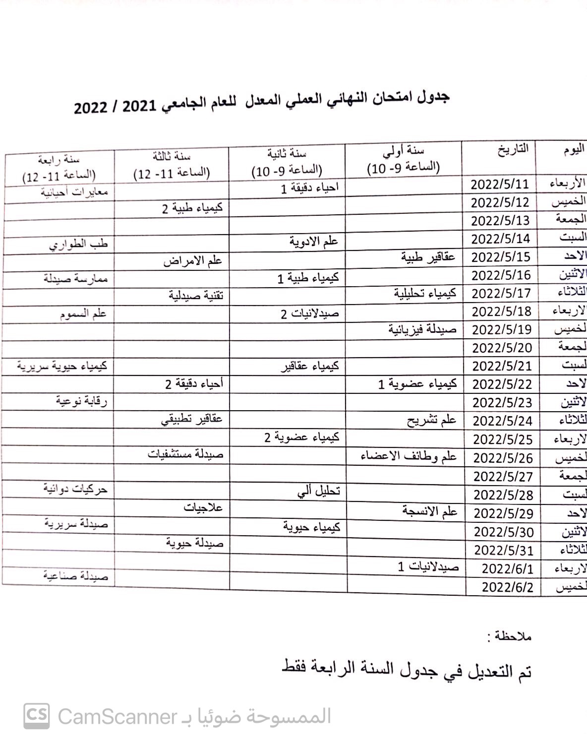 جدول امتحان النهائي عملي المعدل للعام الجامعي 2022/2021