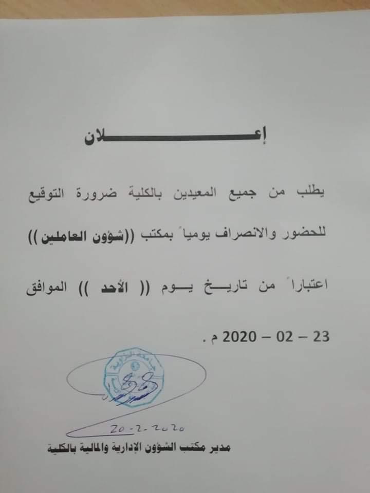 يطلب من جميع المعيدين بالكلية ضرورة التوقيع للحضور و الانصراف يوميا بمكتب (شؤون العاملين) اعتبارا من يوم الاحد الموافق23/2/2020م .
