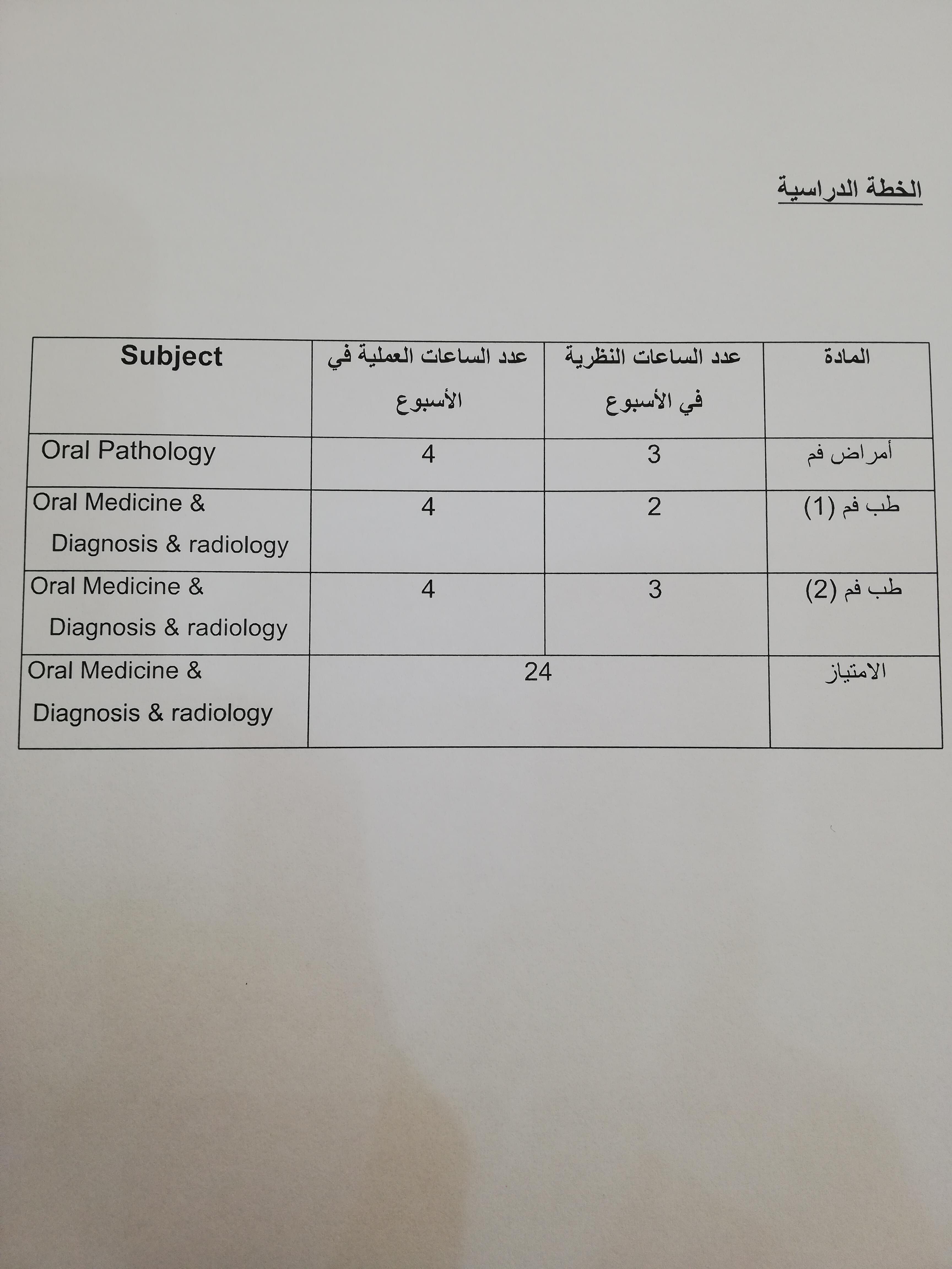 يختص القسم بتدريس عدة مواد وهي طب الفم, تشخيص أمراض الفم, علوم الامراض الفموية وعلوم الأشعة لطلاب السنة الثالثة والرابعة بكلية طب وجراحة الفم والأسنان. كما يقوم الأطباء المتخصصون بالقسم و طلاب الامتياز بتقديم الخدمات العلاجية للمرضى في عيادات الكليةمن خلال تشخيص تلك الإمراض سريرياًوإشعاعيا. ويضم القسم التخصصات الأتيه:- 1)أمراض الفم والوجه والفكينOral and Maxillofacial Pathology يعني هدا التخصص بتدريس طبيعة و سبب الأمراض التيتصيب الفم و أجزاءه والأنسجة المحيطة من خلال دراسة التغيرات المجهريه للخلايا المختلفة , وأيضا دراسة الأمراض التي تصيب أعضاء الجسم عامه وتتميز بظهور أعراض في الفم او في منطقة الوجه و الفكين من خلال الفحوصات المجهريه والسريرية والإشعاعية. 2) طب الفم و التشخيصOral Medicine & Diagnosis فرع ِمن فروع طب الأسنان يختص بدراسة وتشخيص أمراض الفم والوجه وأمراض مفصل الفكين وتشوهات الفم والأسنان والوجه والفكين سريريا. ويختلف طب الفم عن أمراض الفم في كون فرع طب الفم يختص بتشخيص الأمراض سريريا بينما يختص فرع أمراض الفم بتشخيصها مجهريا. كما يساعد طب الفم علي طريقة التشخيص باستخدام طرق مختلفة منها علم الأشعة و طريقة العلاج و التعامل مع الأمراض المزمنة في عيادات الأسنان. 3) أشعة الفم والوجه والفكينOral and Maxillofacial radiology علم الأشعة هو علم يساعد علي التشخيص بعد الكشف السريري و التحاليل المختبرية, حيث أن مادة الأشعة تشمل جميع أنواع الأشعة من تصوير و كيفية استخدم جهاز التصوير و طريقه التصوير و نوع الأشعة و أيضاً يدرس في هذا المقرر كيفيه التشخيص و التفريق بين الأمراض المتشابهة في التشخيص و يشمل تصوير الأشعة للسن و الفكينperiapical ,bite winge , occlusal technique Panoramic (OPG) MRI , CT scan.