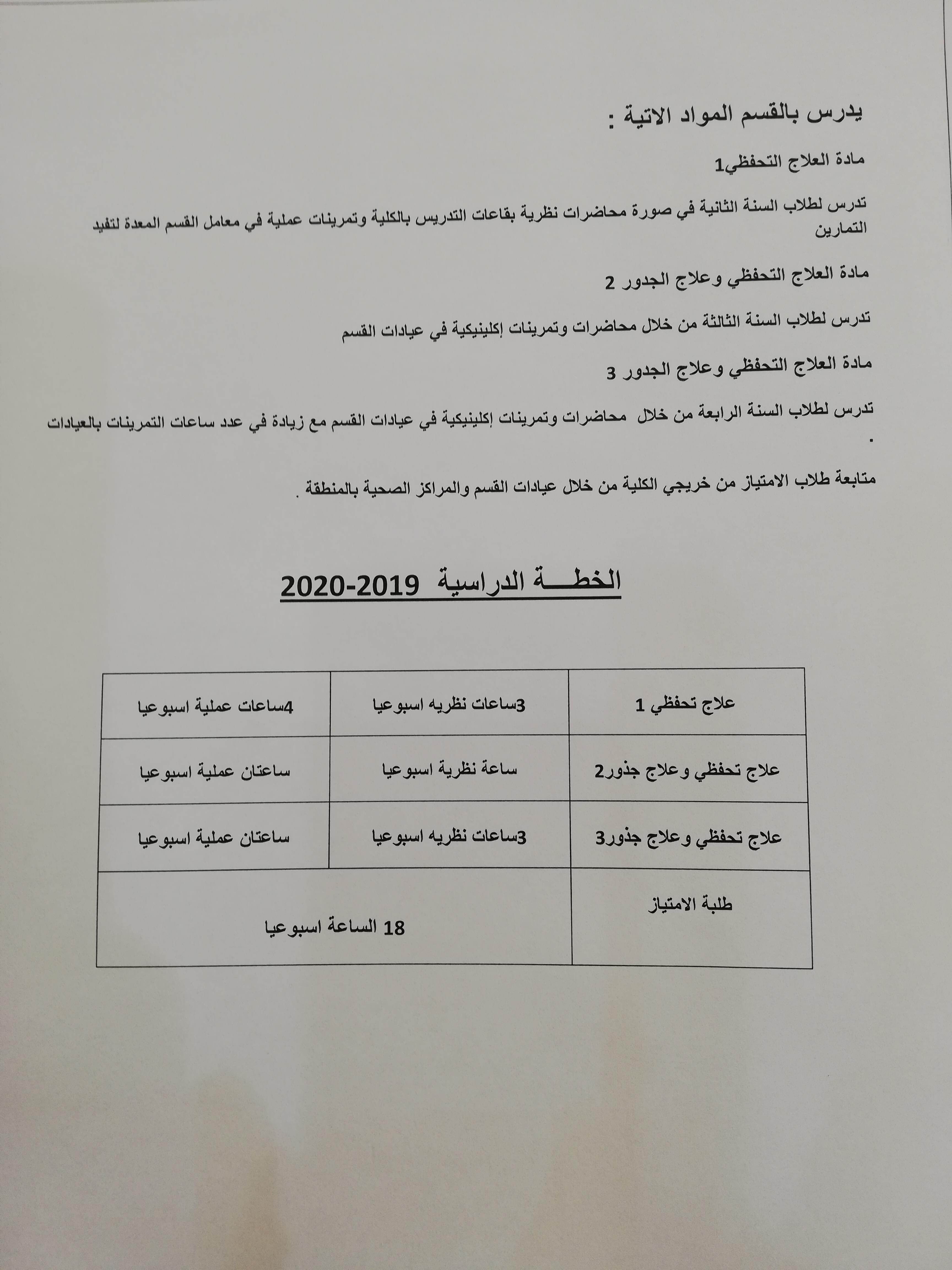 يمثل قسم العلاج التحفظي بفروع حشو الأسنان وعلاج الجذور. هذه الفروع مسئولة عن تدريس العلوم الأساسية و التطبيقيه والإكلينيكية في حشو الأسنان وعلاج الجذور لطلاب مرحلة البكالوريوس.