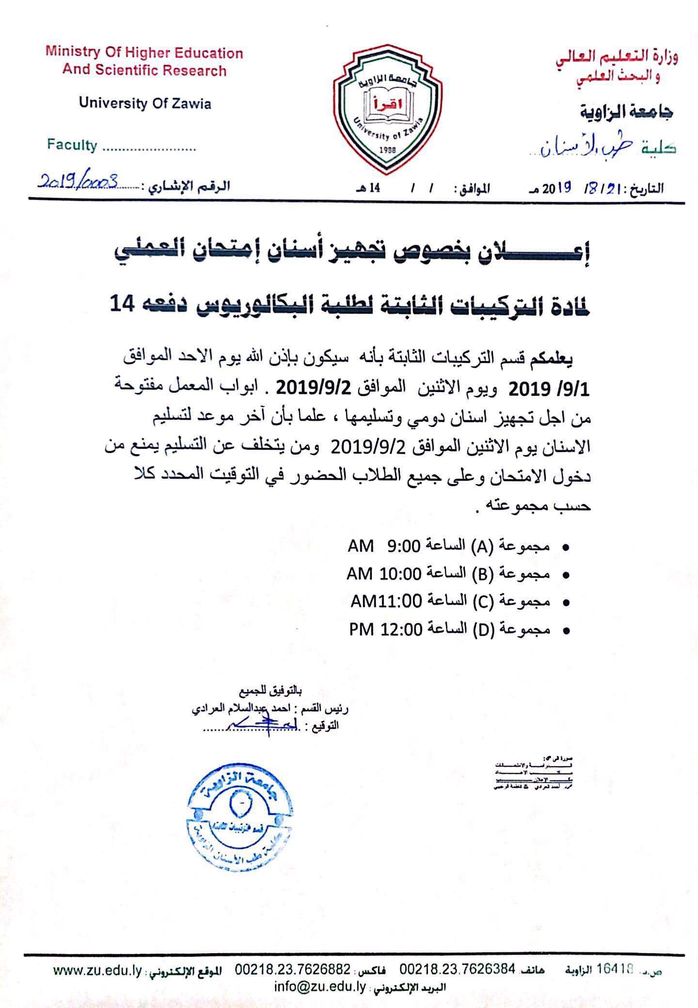 اعلان بخصوص تجهيز أسنان إمتحان العملي لمادة التركيبات الثابتة لطلبة البكالوريوس دفعة (14)