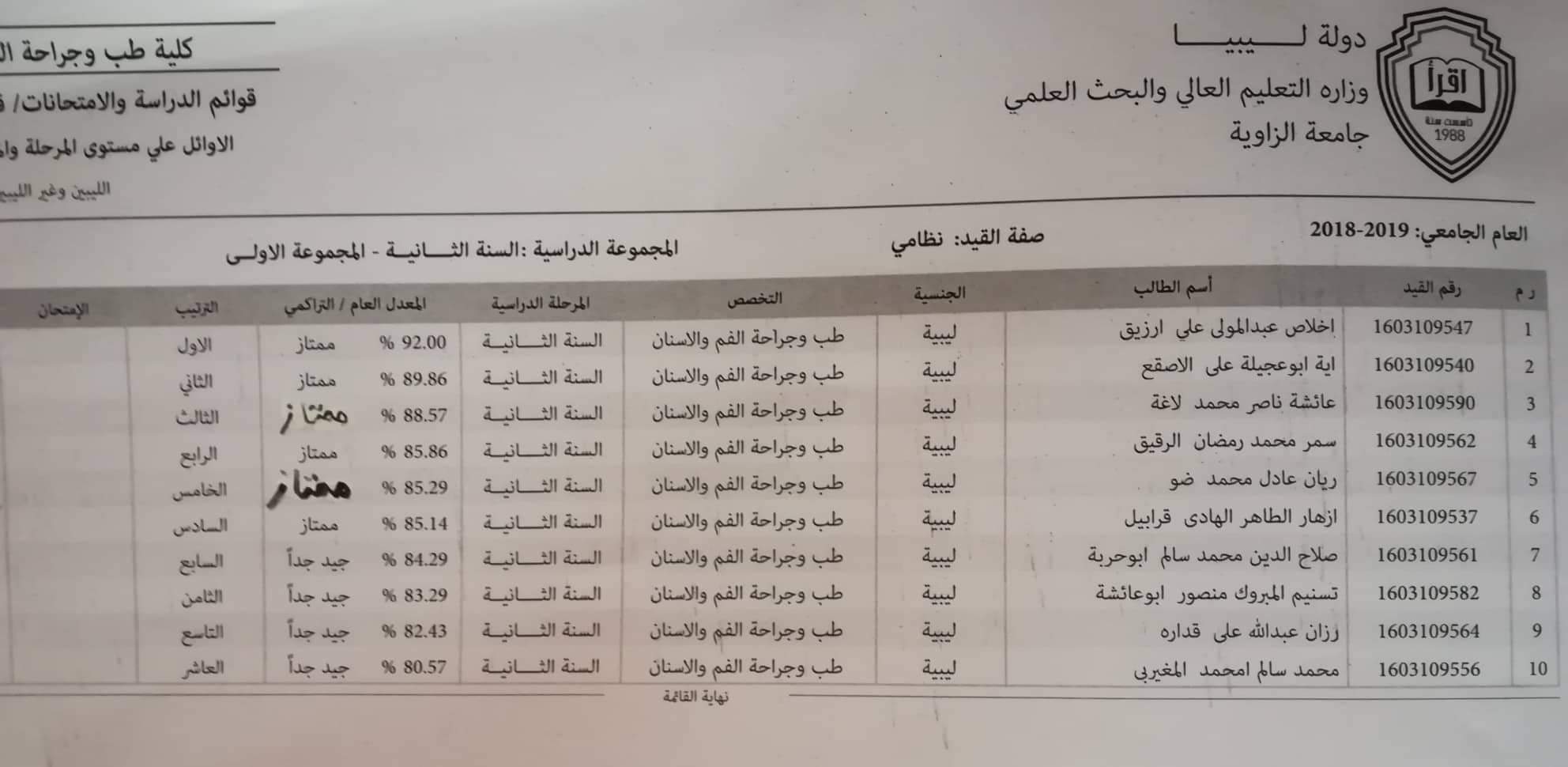 قائمة الطلبة الأوائل للسنه الثانية الدور الأول للعام الجامعي 2018 / 2019