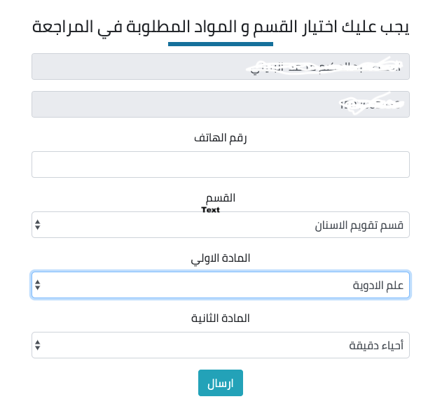 3. تفتح له نافذه بها الاسم ورقم القيد منها يستطيع اختيار ماذتين من مواد الرسوب والقسم التابع له اما بالنسبه لرقم الهاتف فهو اختياري ويتم الضغط علي الارسال