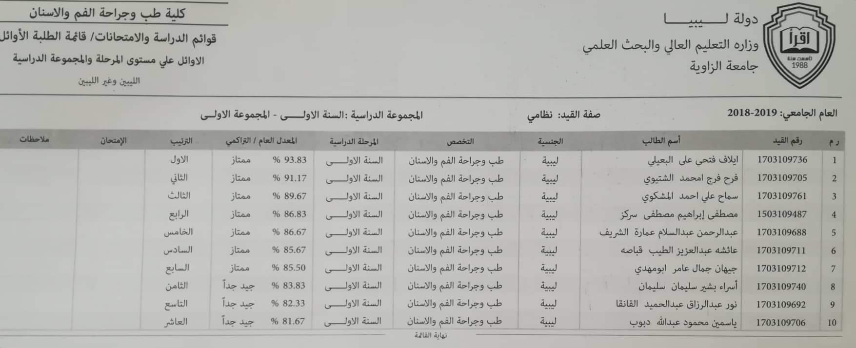 قائمة الأوائل السنة الأولى الدور الأول