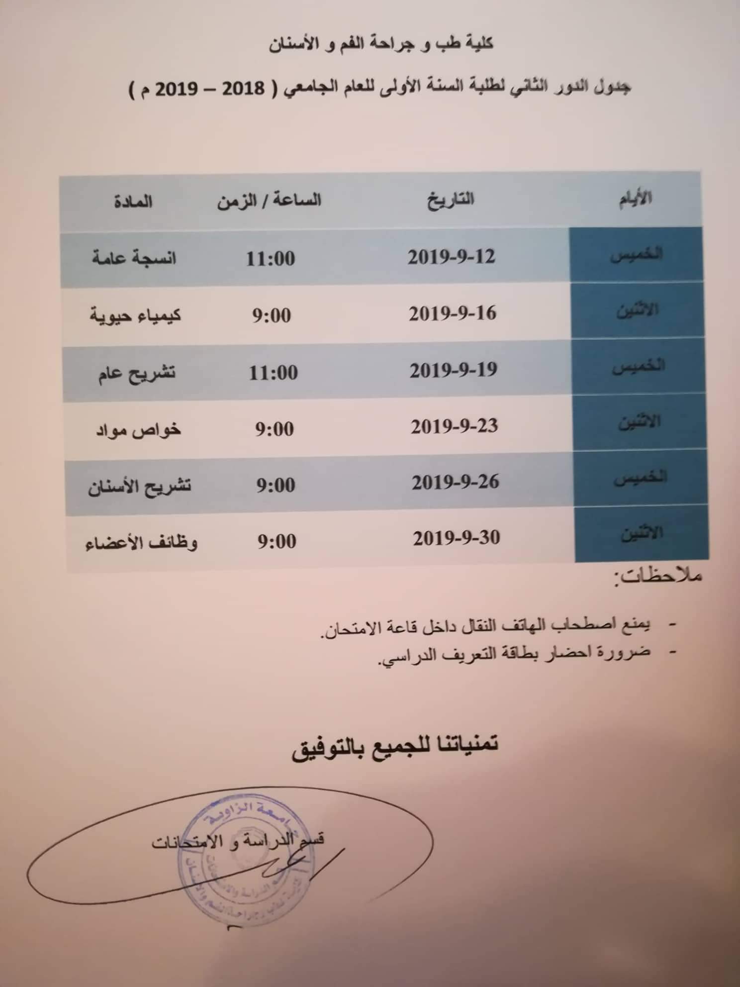 جدول الدور الثاني لطلبة السنة الأولي للعام الجامعي (2018_2019 م)