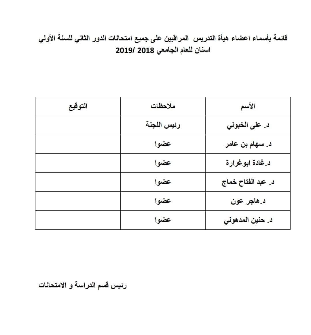 قائمة بأسماء أعضاء هيئة التدريس المشرفين على امتحانات الدور الثاني للسنه الأولى