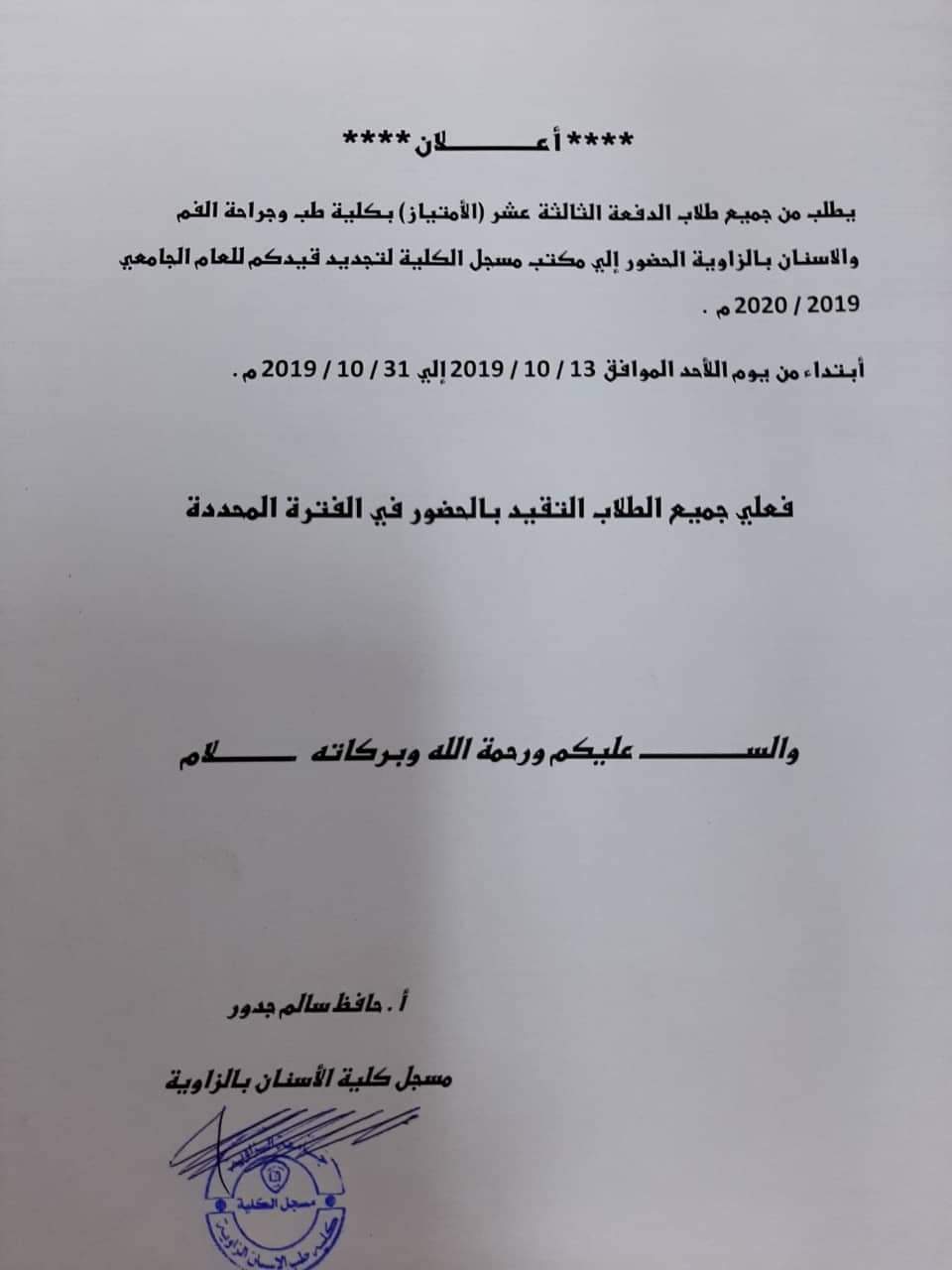إعلان يطلب من جميع طلبة الامتياز الدفعة 13والتكميلي بكلية طب وجراحة الفم والأسنان بالزاوية الحضور الي مكتب مسجل الكلية لتجديد القيد للعام الجامعي_2019_2020 م ابتداء من يوم 13_10_2019 لغاية 31_10_2019 علي جميع الطلاب للاتزام التقيد بالفترة المحدده.