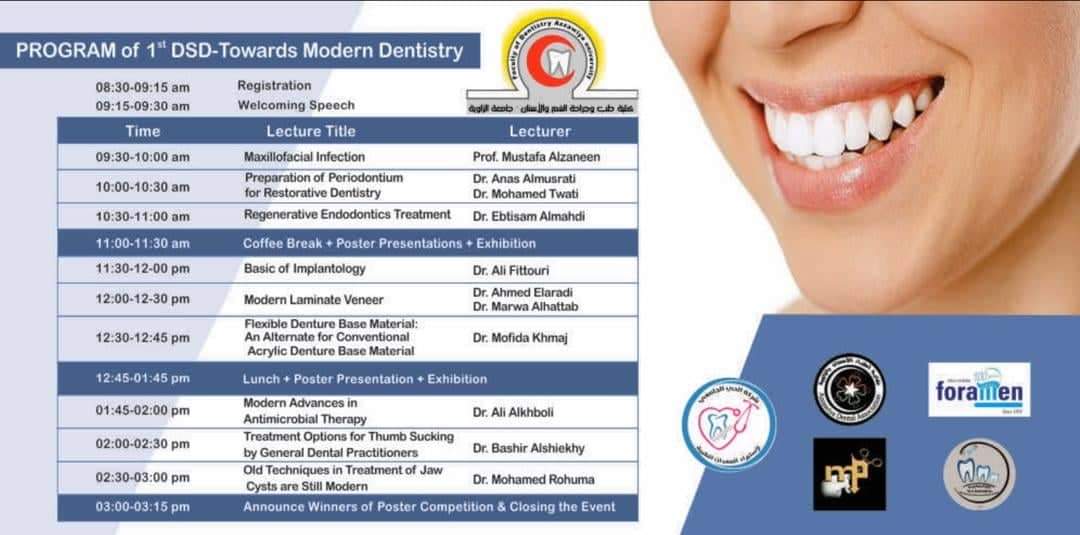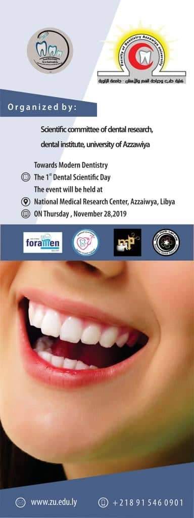 تعلن كلية طب وجراحة الفم والأسنان - جامعة الزاوية بالتعاون مع نقابة أطباء الأسنان وبإشراف لجنة البحث العلمي بكلية طب الأسنان عن إنعقاد اليوم العلمي الأول وذلك يوم الخميس الموافق 28/11/2019