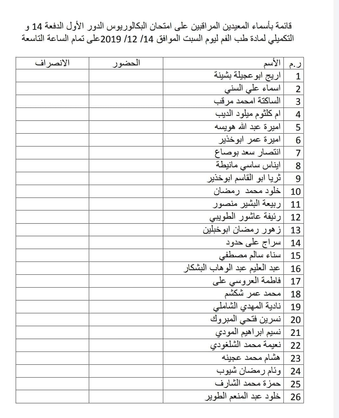 قائمة بأسماء المعيدين المراقبين على إمتحان الدور الأول ليوم السبت الموافق 14 /12 /2019 لمادة طب الفم الدفعة 14 والتكميلي ،،يرجى الألتزام بالحضور للأهمية