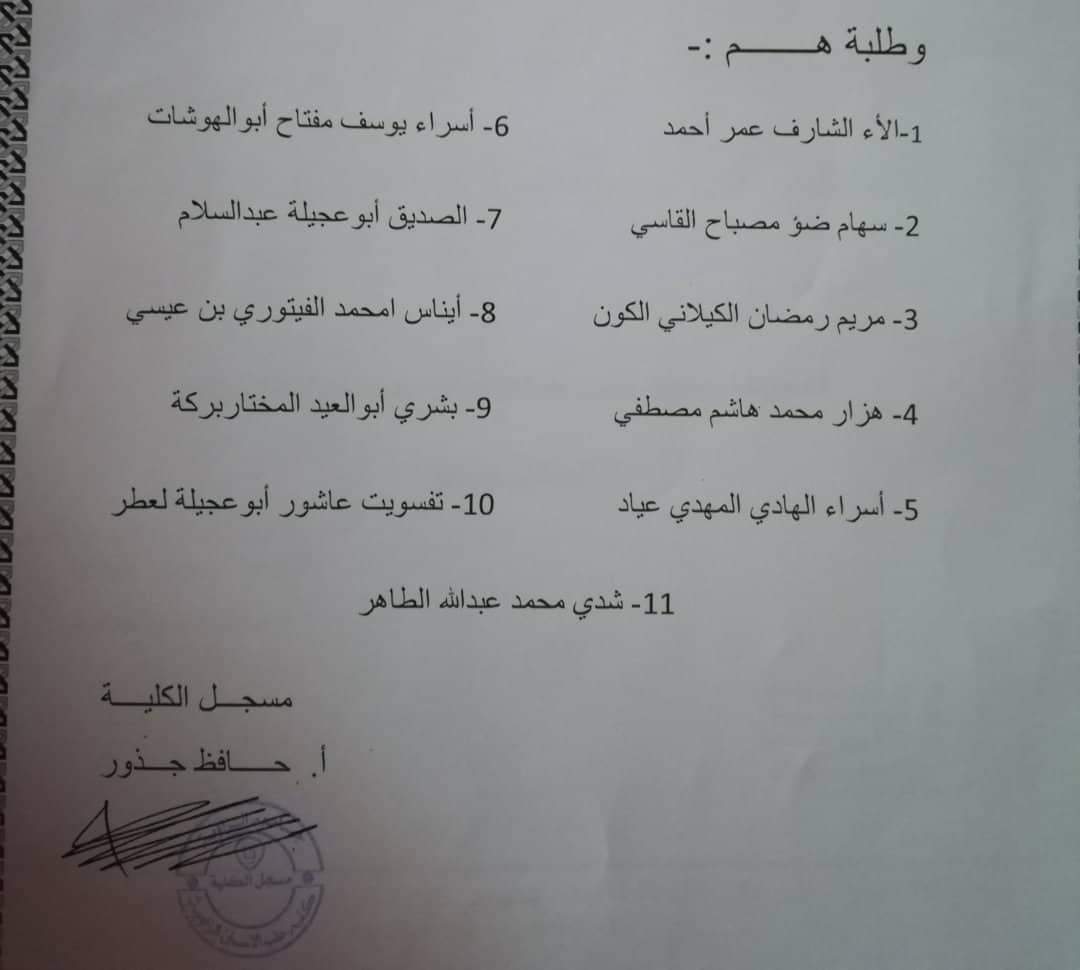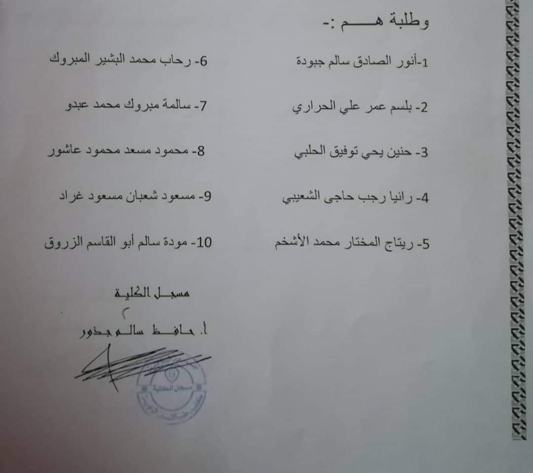 إعلان لطلبة الاتيه أسمائهم ضرورة الحضور يوم الخميس الموافق 23 / 1 / 2020 على تمام الساعة 10 الي مكتب المسجل بالكلية