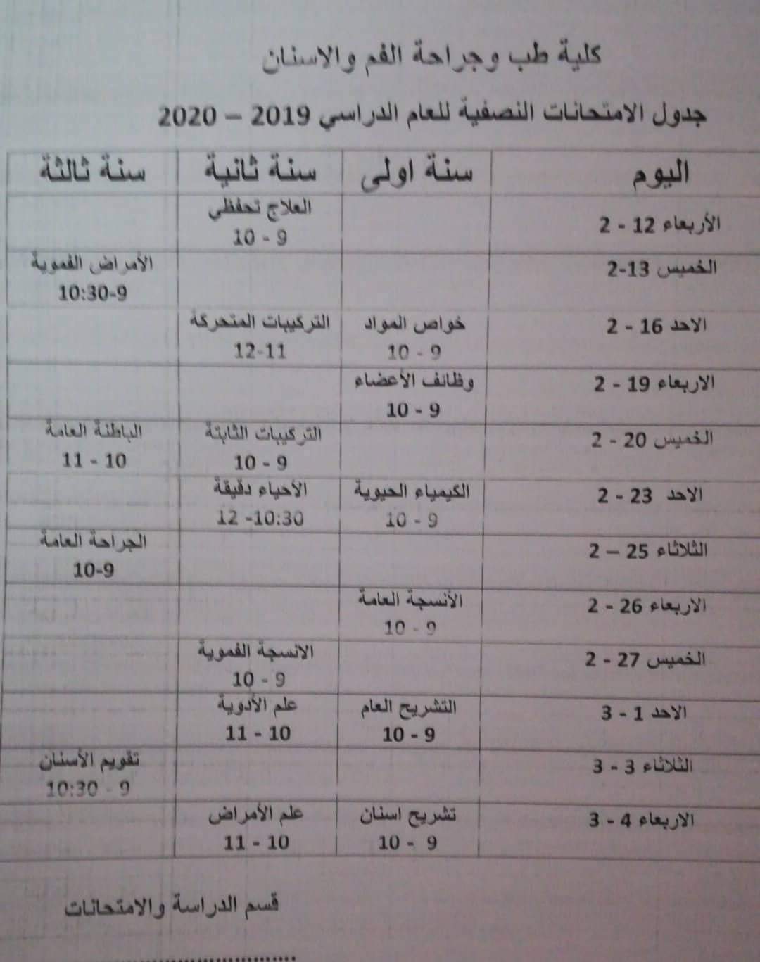 جدول الامتحانات النصفية للعام الدراسي 2019_2020 بعد التعديل