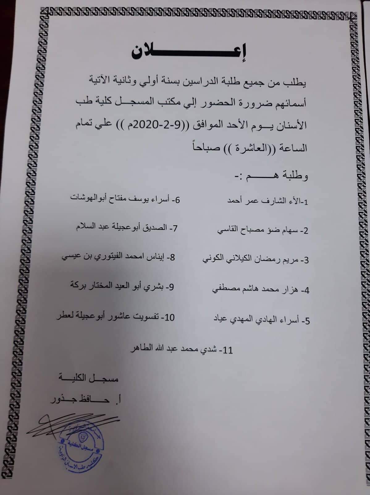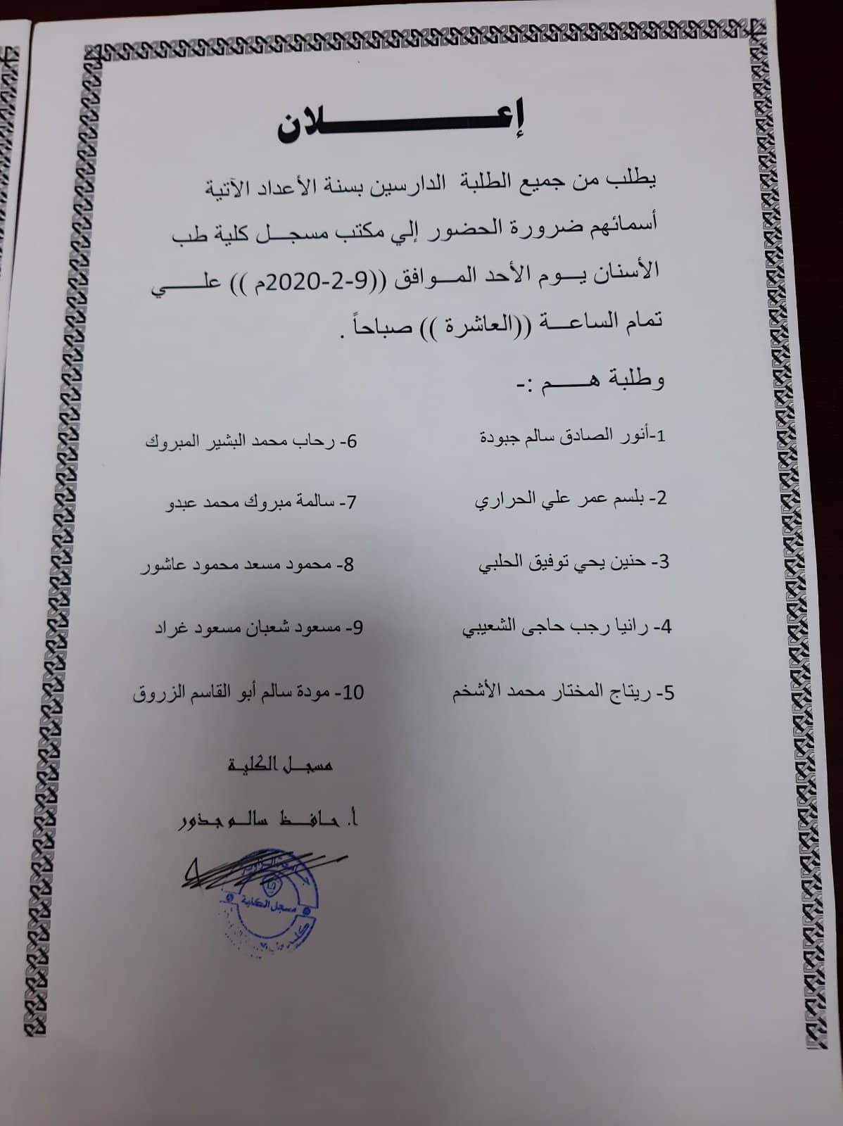 إعلان للطلبه الاتي أسمائهم بضرورة الحضور يوم الأحد القادم الموافق 9 / 2 / 2020 الي مكتب مسجل الكلية، للاهمية يرجى الالتزام بالحضور