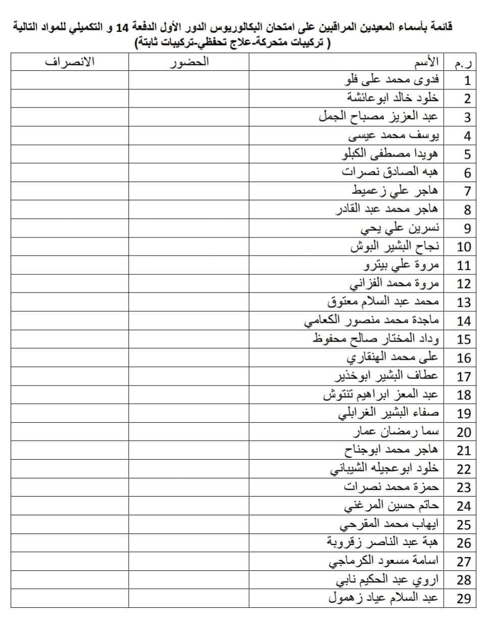قائمة بأسماء المعيدين المراقبين على امتحان الدور الأول لمادة التركيبات الثابتة ليوم السبت الموافق 8 / 2 /2020 على تمام الساعة 9 يرجى الالتزام بالحضور