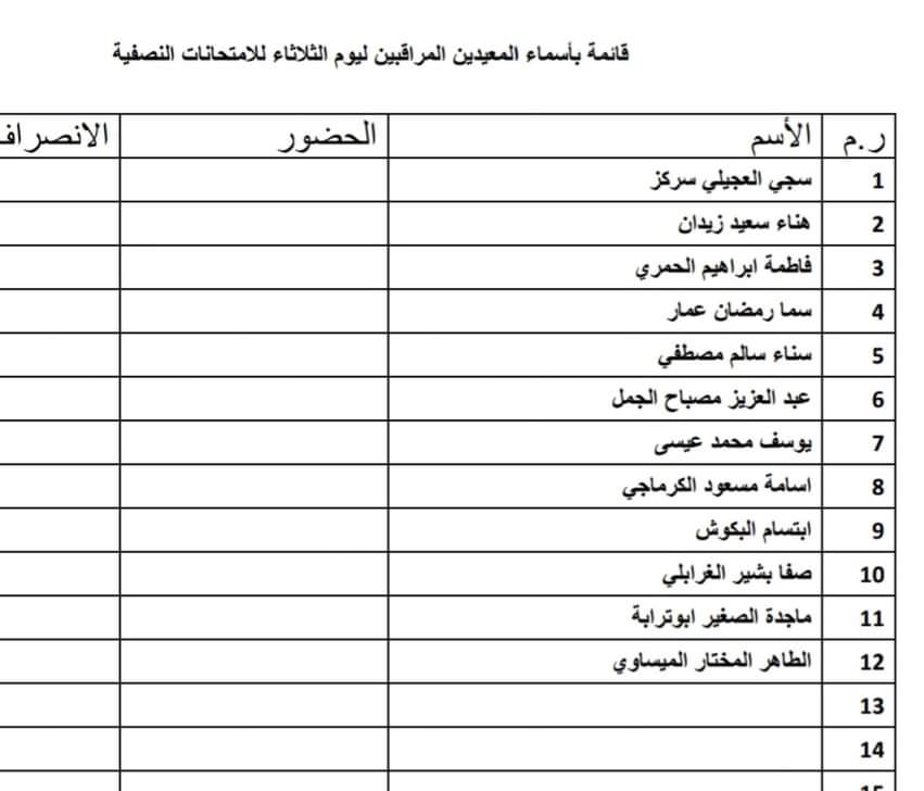 قائمة المراقبين للامتحان النصفي ليوم غذا الثلاثاء