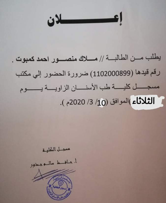 يطلب من الطالبة ملاك منصور أحمد كمبوث ضرورة الحضور الي مكتب مسجل كلية طب وجراحة الفم والأسنان الزاوية يوم الثلاثاء الموافق 10_3_2020