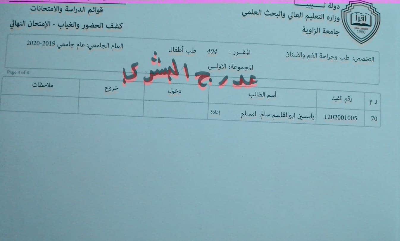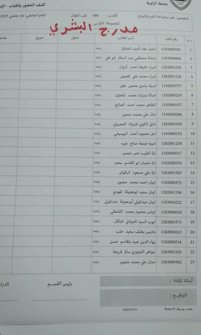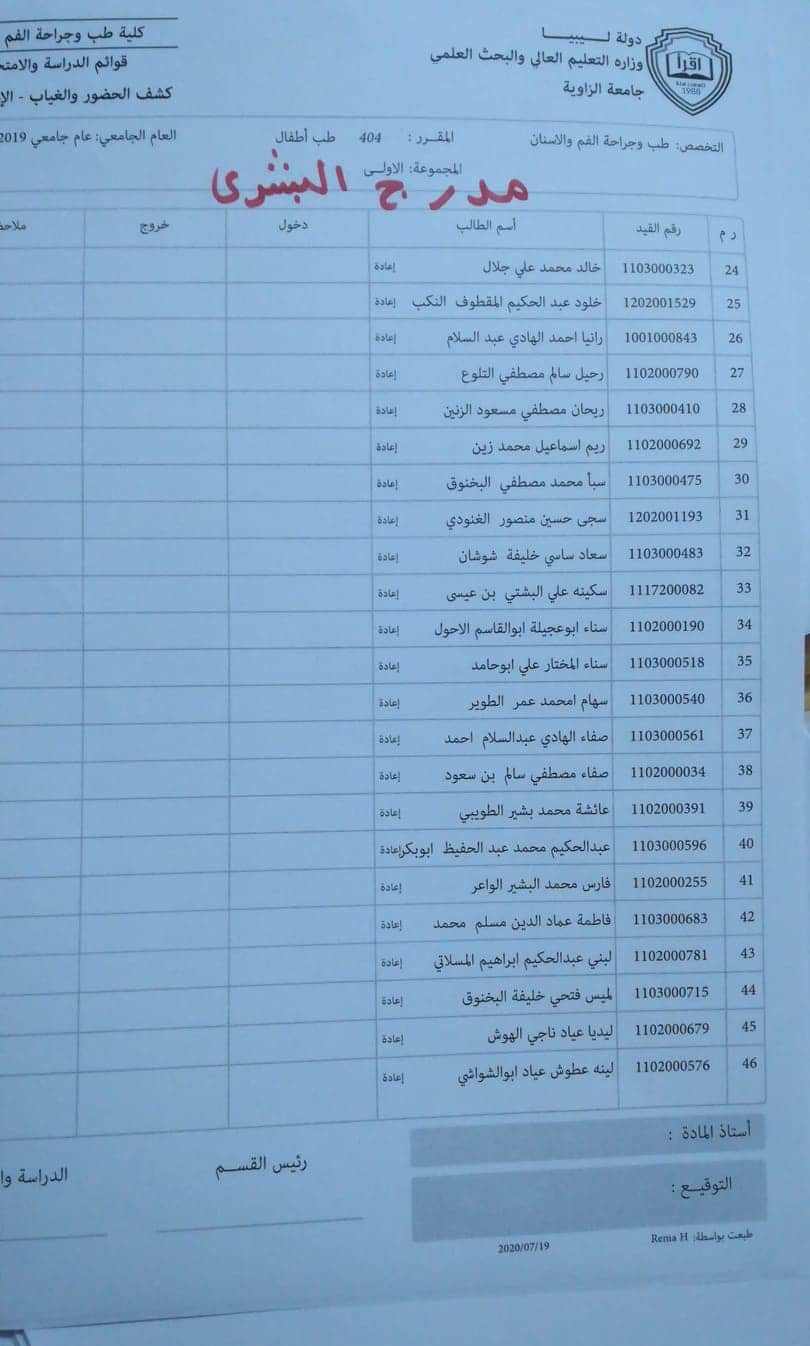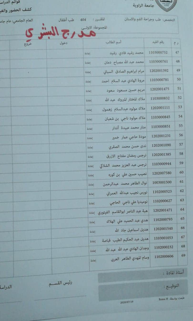 توزيع قوائم طلبة التكميلي للامتحان مادة طب الأطفال ليوم غذا الاثنين الموافق 20_7_2020 بمدرج البشري