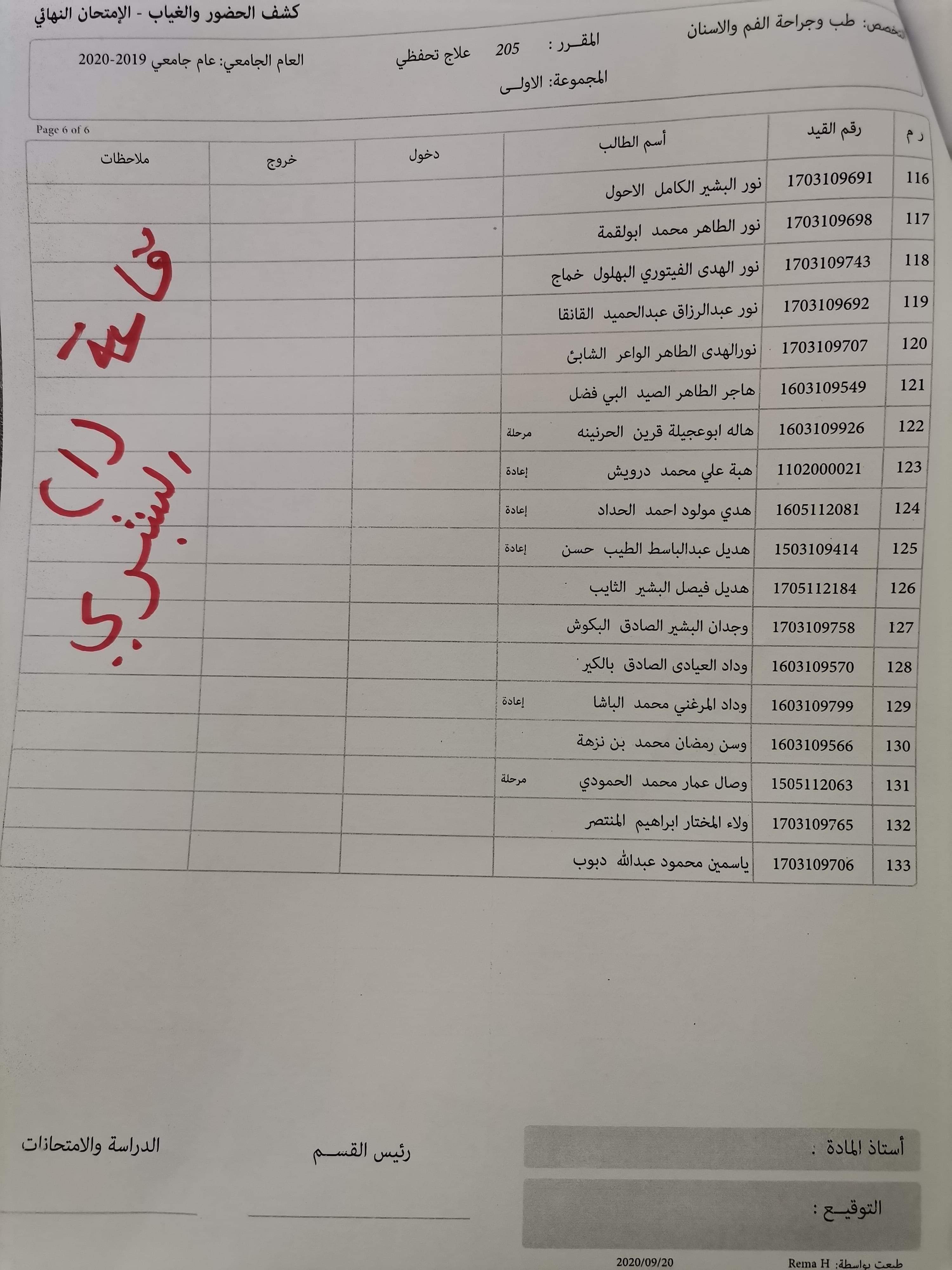 قوائم توزيع القاعات للامتحان يوم السبت الموافق 26/9/ 2020 على تمام الساعه 9 لمادة العلاج التحفظي للسنه الثانيه الدور الاول للعام الجامعي 2019 / 2020 بالتوفيق للجميع، يرجى الإلتزام بالإجراءات الوقائية