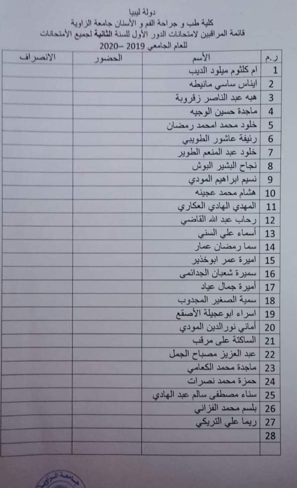 قائمة المعيدين المراقبين على امتحان السنة الثانيه الدور الأول ليوم غذا الخميس لمادة علم الأمراض العام الموافق 8 / 10 / 2020 على تمام الساعه 9:00