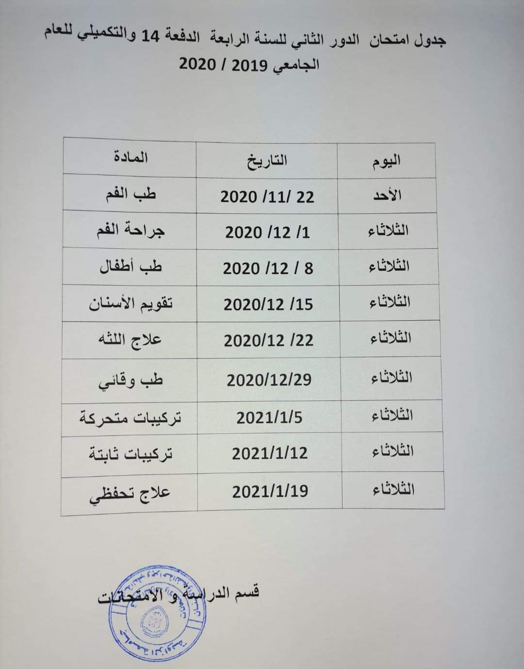 جدول إمتحان الدور الثاني لسنة الرابعة الدفعة 14 والتكميلي للعام الجامعي 2019 /2020